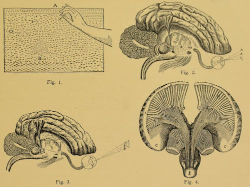 On the basis of this connection he ascribed to the ›Cerebellula› a very important rôle in the activity of the brain. In the first place they received, through the external sense-organs and nerves, impressions from the outer world and worked them over: they were a kind of inner sense-organs.[33] And since the sensory impressions were so richly various as well in kind as in degree, the ›Cerebellula› must also possess various individual qualifications corresponding to these various sensory impressions. They were, at the same time, connected with one another, and so arranged into superior and inferior groups that they could receive and work over the various kinds of sensory impressions.[34]