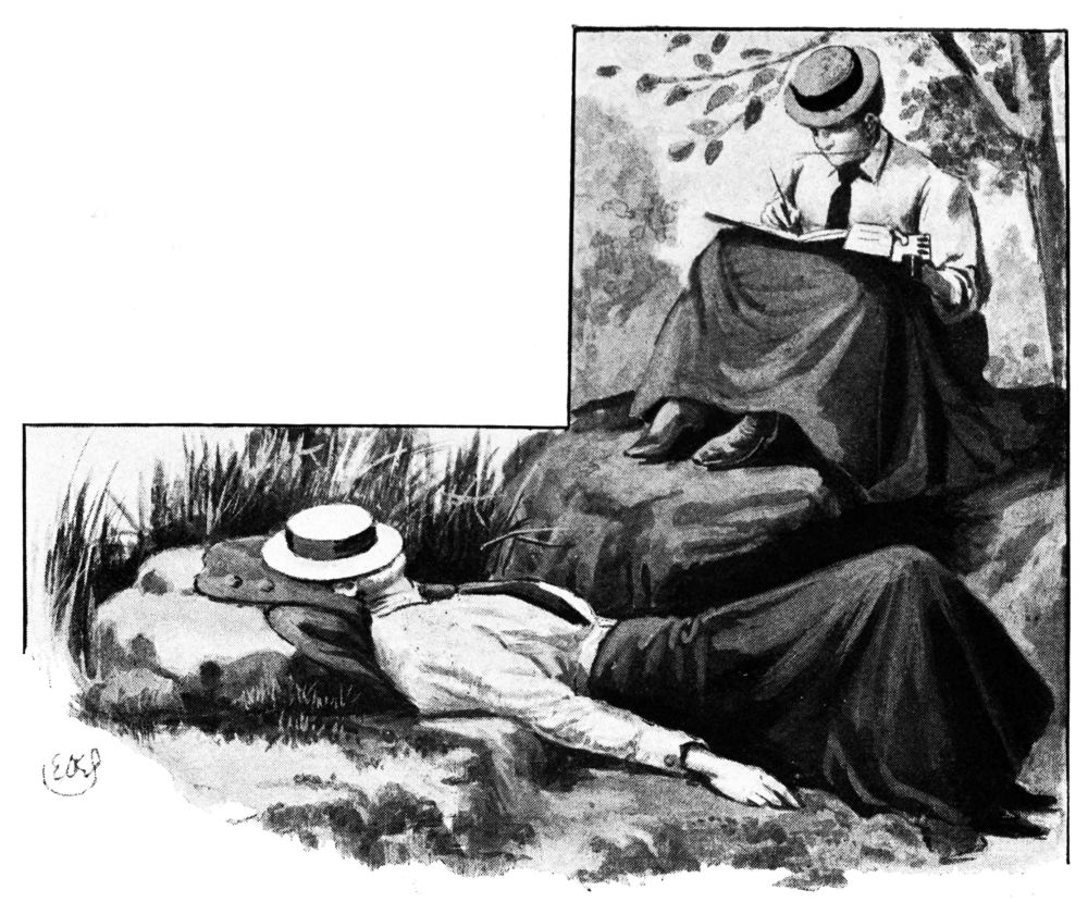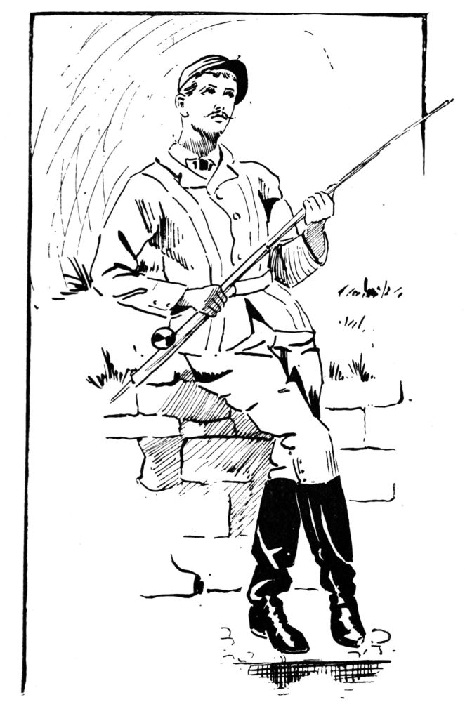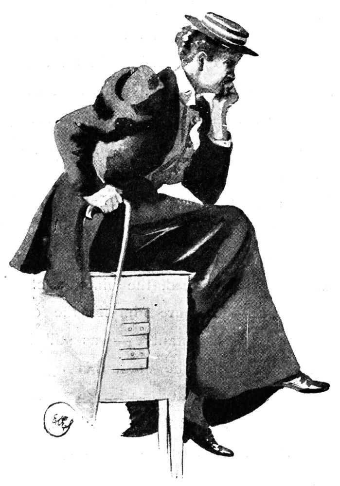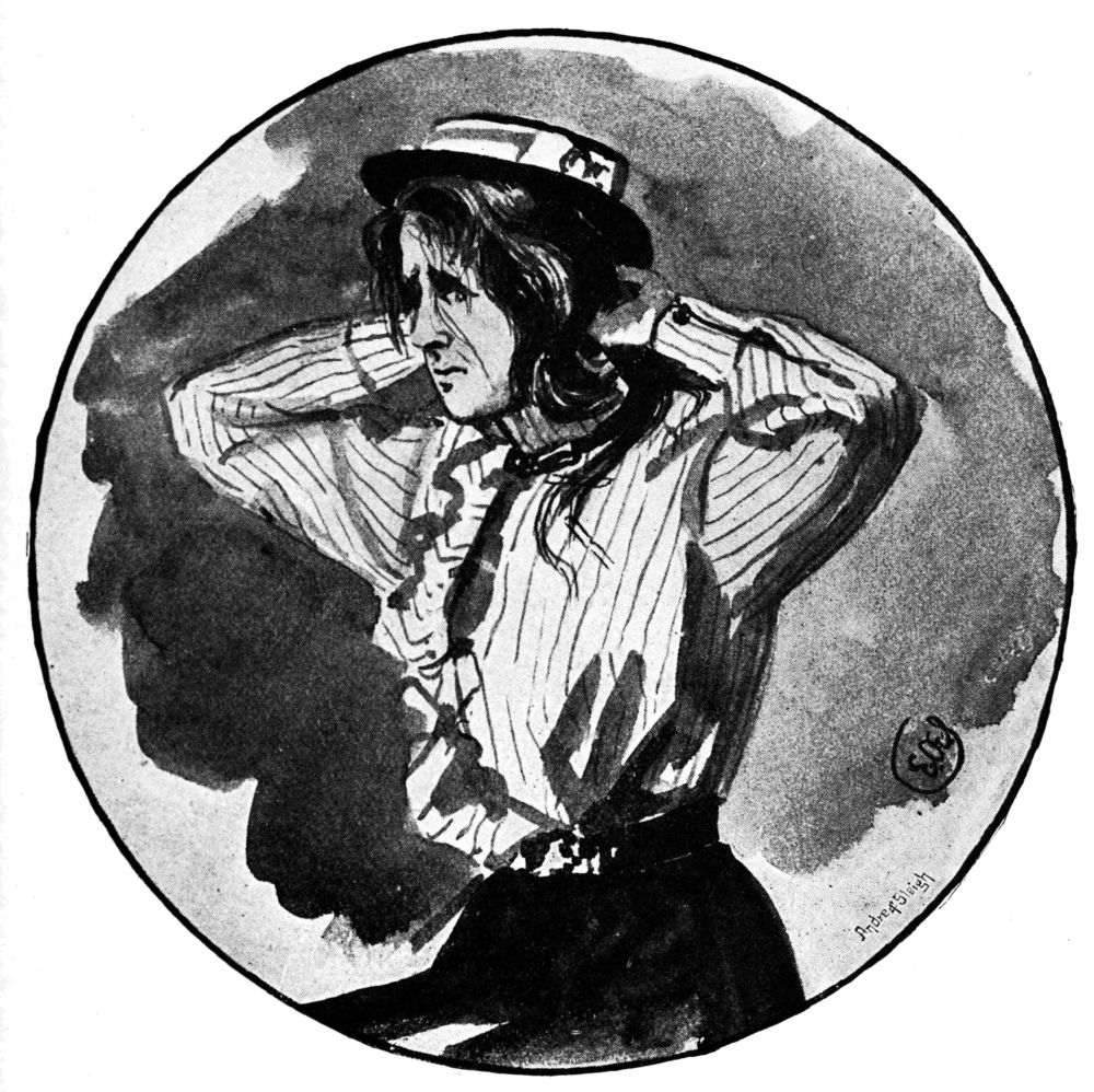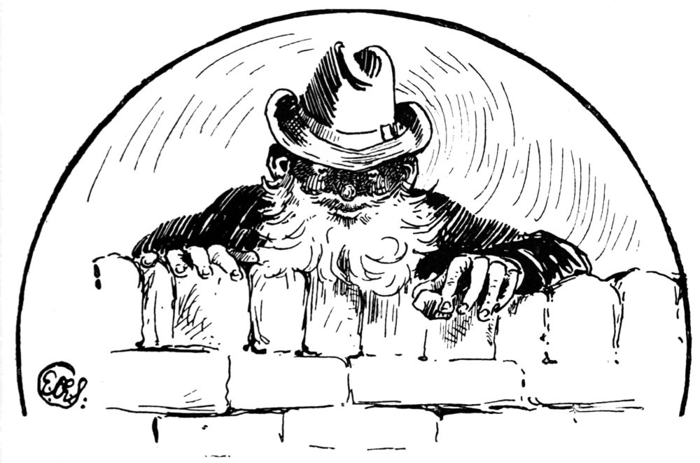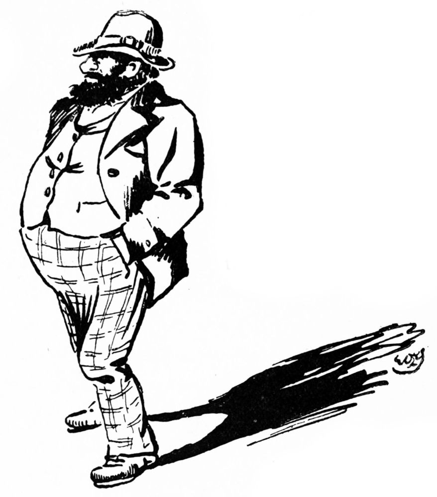held high carnival in the garden above. It was here, probably, that Mr Willy Griffith cast his flies when in residence at the Griffith Arms; and Miss O’Flannigan absently added the figure of a youth of shop-walker beauty, in the guise of a fisherman, to the series of enervated scribbles which marked her sketch-book’s progress through that long hot Sunday. She was descending to the addition of{46} an eyeglass and a cigarette, when a pebble dropped into the water beside us. As we looked up to the parapet of the bridge, another pebble was dropped, and there was an eldritch falsetto laugh. We caught one difficult glimpse of a grey beard and a Tyrolean hat, a running footstep resounded above, and then silence. It seemed time for evening church, and we retired.{47}