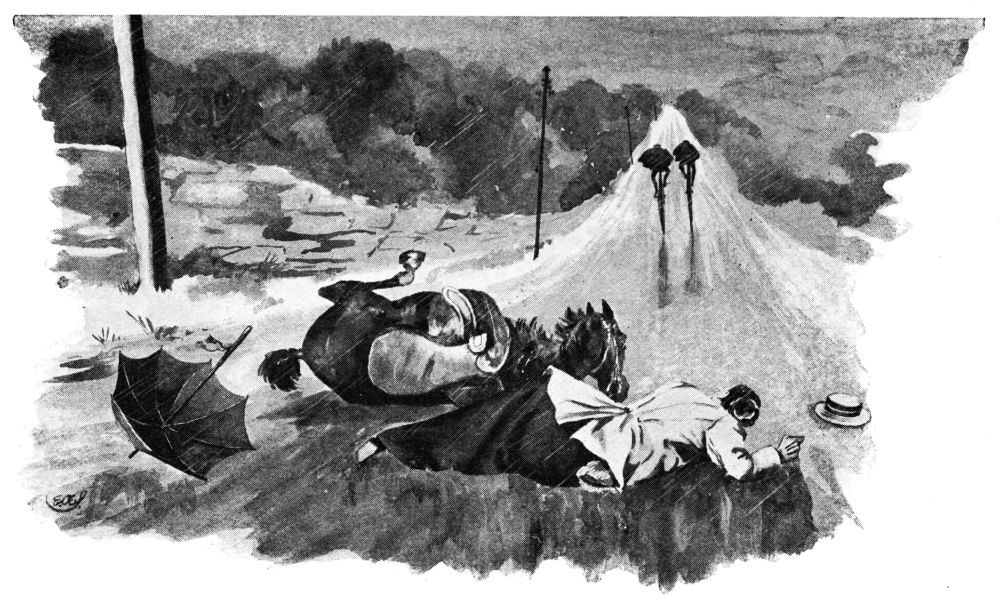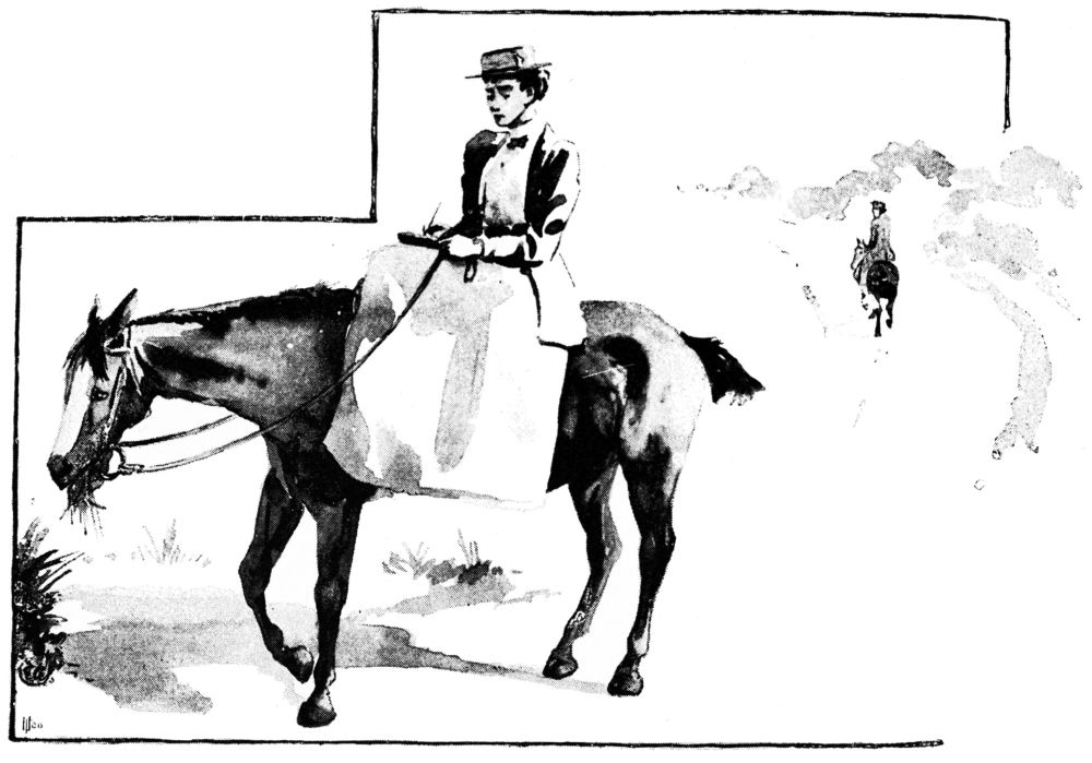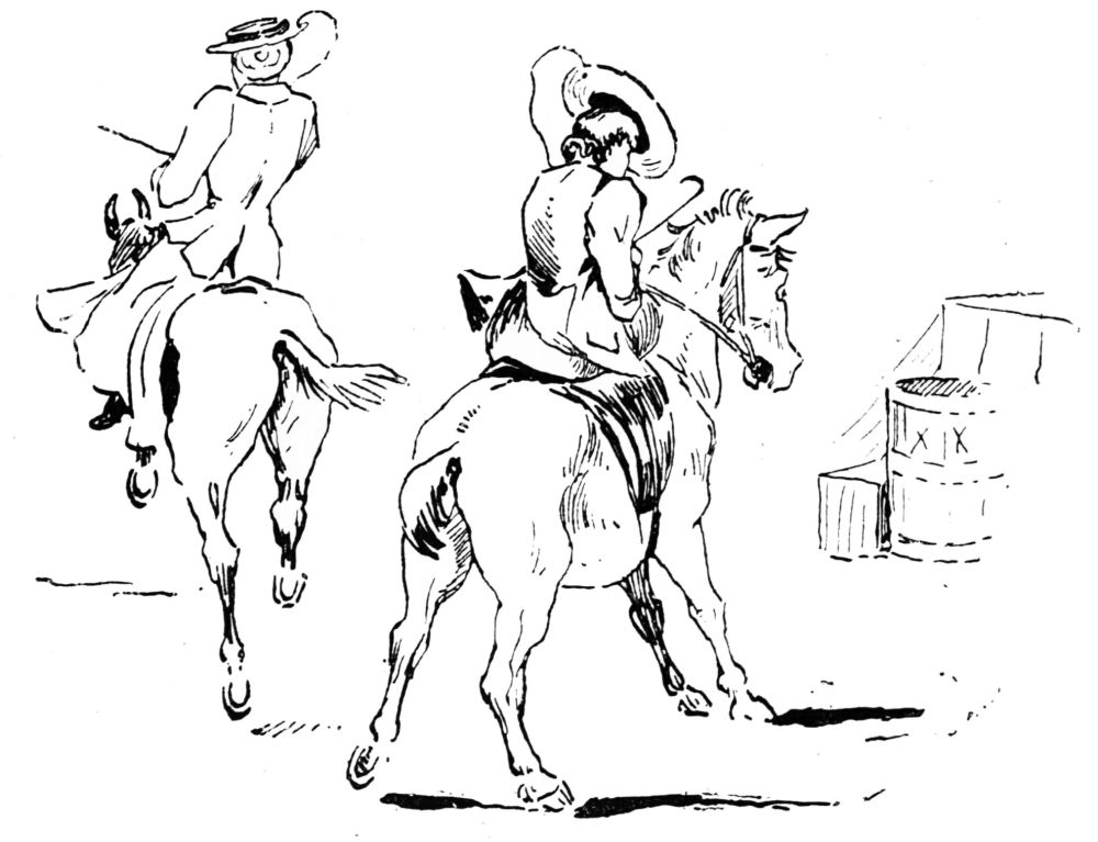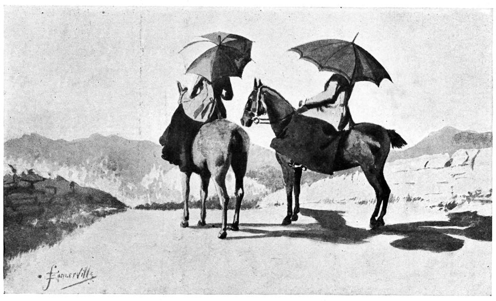 Draped in horse-sheets to keep the saddles dry, the Tommies presently stood at the door; and swaddled, like cabmen, in comforters and capes, we came forth and mounted. During the process of sorting the reins, the umbrellas, and the tips for the two ostlers, we could not but be aware of the guileless enjoyment of the hat department opposite, and the more critical but equally unaffected interest of the circus ladies and gentlemen at the window of a ground-floor sitting-room. As we unfurled the pink parasol and the tent-like gingham and went down the street like a pair of fungi on four legs, the chorus that broke from the ground-floor window was acutely audible:—