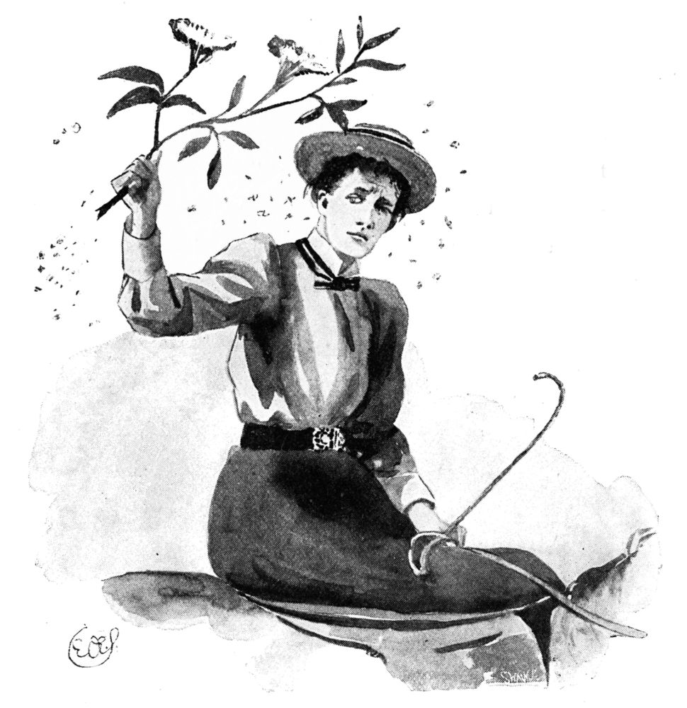 Ireland seemed a long way off, while we lunched largely and languidly on fruit and cream, and wondered how we were going to ride through four counties in heat of this kind. A sense of inadequacy grew upon us like a slight indigestion, or, perhaps, it came to us in that guise, and the fussy clatter of ponies’ hoofs in the yard below had a ring in it of the inexorable. Miss O’Flannigan sharpened a pencil and began to make notes, evidently to restore her moral tone,—notes about Welshpool, she said, antiquities, and such things; but as subsequently these proved to consist of the entry, “Saturday, June 10, ‘Black and White,’ lunch, Academy, headache, tea, tried on, &c.,” with a bulbous profile of the ironmonger, her method of working back to ancient history must have been mystic and gradual.
