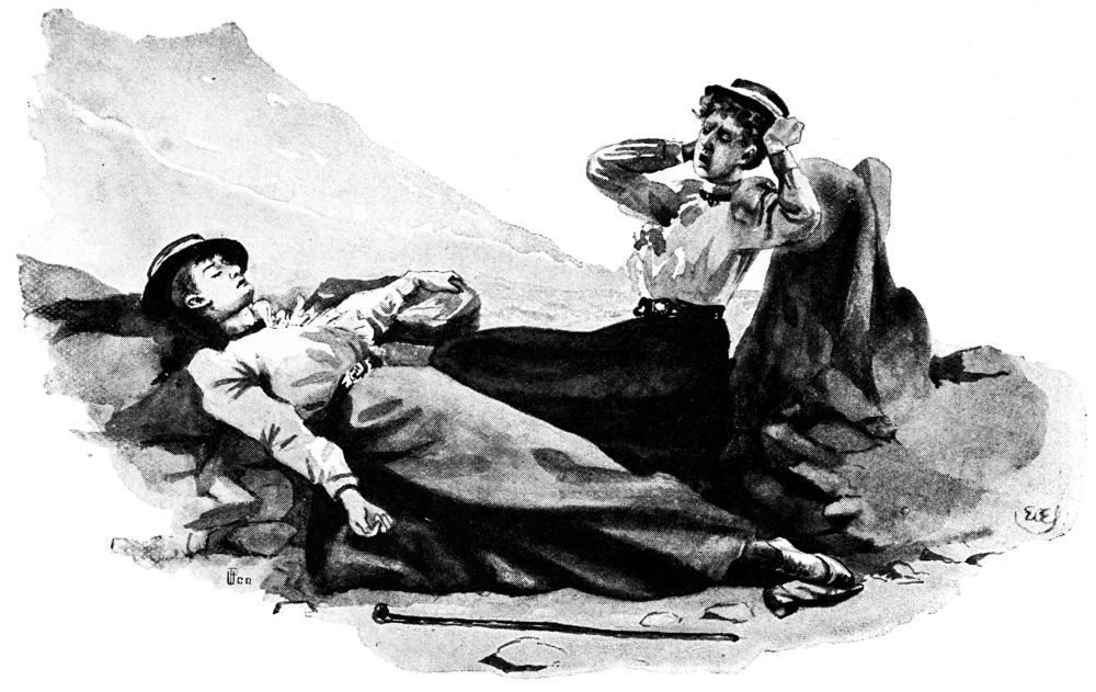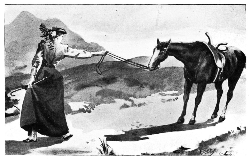 It was not a good ten miles that we rode from there to Corwen, except in the sense of good, full, statute measure. Disaster fell upon us like a net, tangling our endeavours with inexhaustible mesh. A “dee” of my saddle broke; consequently{164} I had to carry the hold-all across my lap, like a baby of monstrous size and implacable pig-headedness. Tom the elder developed a new and much enlarged edition of his ancient girth-gall, and in the attempt to cope with this by re-saddling, a cushion of swelling was disclosed along his back. Miss O’Flannigan then said she would lead him the rest of the way, and did so, until the next milestone announced that it was four miles to Corwen, which at once degraded the project from the sublime to the ridiculous. Not all the Humane Society, in one throbbing merciful mass, could be absurd enough to expect any one to walk four miles in a riding-habit, and cloth gaiters, and the dog-days.