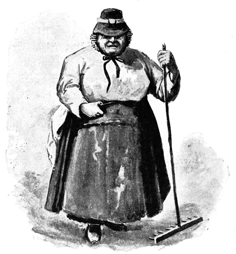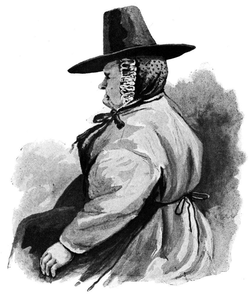 The morning was obviously one to sacrifice to expeditions, and any tourist worthy of the name would no doubt have been by noon on the top of Cader Idris or the Torrent Walk. The landlady of the “Angel,” looking more than ever like Miss O’Flannigan’s aunt, urged us to these and other courses with veiled reproach, as she would have reminded the impenitent of evening service, but the hills in whose lap Dolgelly lies remain unexplored by us. Others have been more conscientious; to them be the glories of accomplishment and the fell privileges of description. The one{66} and only thing that Miss O’Flannigan desired to see was a Welsh woman in a Welsh hat; but this, the landlady was forced to admit, was the one and only thing not procurable in Dolgelly. There was the sextoness of the church, an octogenarian, who had preserved her mother’s hat—perhaps she would do. In half an hour Miss O’Flannigan was driving the octogenarian before her, carrying a band-box as old and yellow as herself; and the rest of the morning was spent in the seclusion of the hotel garden, where, seated on an upturned bucket, the octogenarian balanced the heirloom upon her spotted cap, while Miss O’Flannigan produced studies of her that were more forcible than polite.