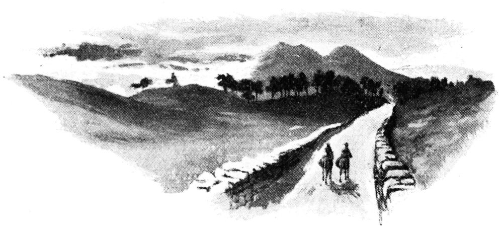 Hitherto farewell had been slightly said, with a few backward looks of good feeling, a few civil wishes for an indefinite return. But at Bettwys, for the first time, and perhaps also because it was—of this vagrant expedition—so near the last, parting gave pain. Turning on the face of a hill we looked back over the valley and across the flitting showers to the peaks of Snowdon and Moel Siabod, a retrospect to be remembered and thirstily to be desired in other summers. Darkly and greenly the woods sank into every cleft, or rose with the piled-up landscape till the cold breast of Snowdon was half hidden behind them. A river, whose name is quite immaterial, plunged uproariously down to the five crooked arches of Pont-y-{156}Pair bridge in Bettwys, then, finding itself suddenly in good society, pulled itself together and swam tense and flat round a curve to present itself decorously to what I think we are safe in asserting to be the river Conway. It was true that half-pay generals and forlorn honeymoon couples haunted the bridge and hung round the post-office, that “well-appointed conveyances” were daily braying forth with horns the multitudinous entry of the tourist, also that the glass was falling; none the less we should thankfully have turned the Tommies down the hill again and remained without purpose or limit at Bettwys. Then, indeed, might many periods have been instructively framed around the names of the Miner’s Bridge, the Swallow Falls, and Dolwyddelan Castle, all of which the guide-book assured us with chaste esteem were “well worthy of a visit.” All that now remained was to turn away from the parapet of the wooded precipice, from whose edge we were looking back, and pace lingering forth towards Corwen.{157}