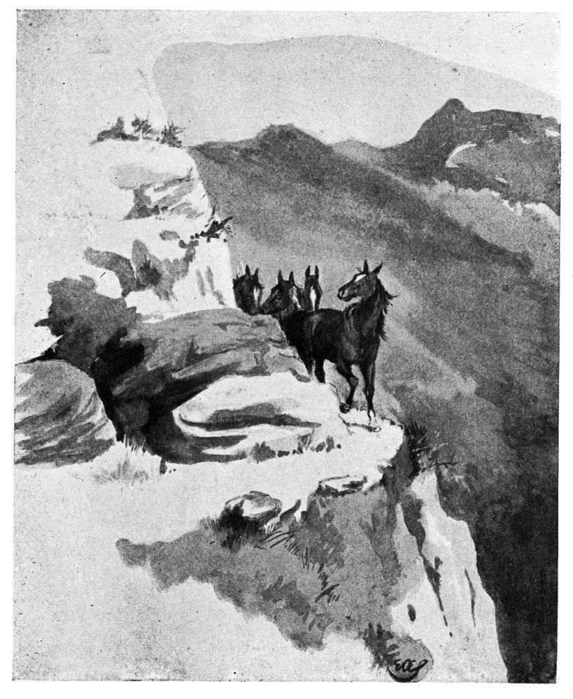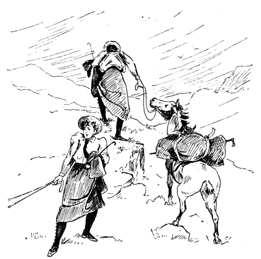 When it came to the descent of the mountain, we resolved to be merciful and lead the Tommies—a praiseworthy benevolence, but one not valued by Tom as it should have been. With stiff forelegs and resentful eye, he was dragged by Miss O’Flannigan down the immeasurable lengths of steep road, protesting in every hair against a mode of progress that was not, to his conservative mind, justified by precedent. Moreover, being sensitive to what was outré in appearance, he may have taken exception to the puggaree made by Miss O’Flannigan out of bracken and a painting rag; but as, to our certain knowledge, he would have hungrily eaten either if left alone with it, we cannot but regard this as an affectation.{57}