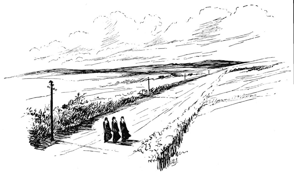 After this the road was quiet in the balmy quietness of summer, that is so living a thing compared with the soulless grip of the air in winter silences. By the dignified gradients of the coach-road we mounted slowly through woods and glens, and then, with no less dignity and almost equal slowness, downwards into open country, clear and kindly, with pasture, and level roads, and a wide eastward horizon melting into blue. Behind us the Snowdon range stood mightily on the high pedestal of Carnarvonshire: it had never showed itself so great as now, viewed from these Denbigh meadow-lands, while we rode{161} to the east, with faces turning always back to the splendid barrier across the west. It was a lonely road, with scarcely a mark to ruffle its white dust except the ribbed footprint of the traction-engine, that stretched like an illimitable ladder in front of us. We met no one save two tramps who eyed us curiously, as members of the fraternity who ought to be able to impart useful facts about the temper of the nearest farmer’s wife, or the quality of the skilly at the Llanberis workhouse; a little farther on, on a long reach of road, quite remote, as it seemed, from human habitation, we met three tall women, dressed alike in widows’ weeds, and each pressing a pocket-handkerchief with a wide black border to the point of a pink nose. Their eyes turned at us above these emblems of woe with something of interest, but they did not pause, and went on, three black blots on the white road between the glowing hedgerows; and we marvelled if some Welsh Mormon elder had lived and died, unknown, but obviously lamented, in these sunny solitudes.{162}