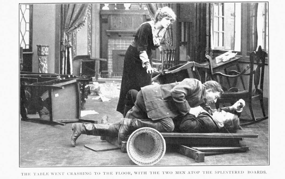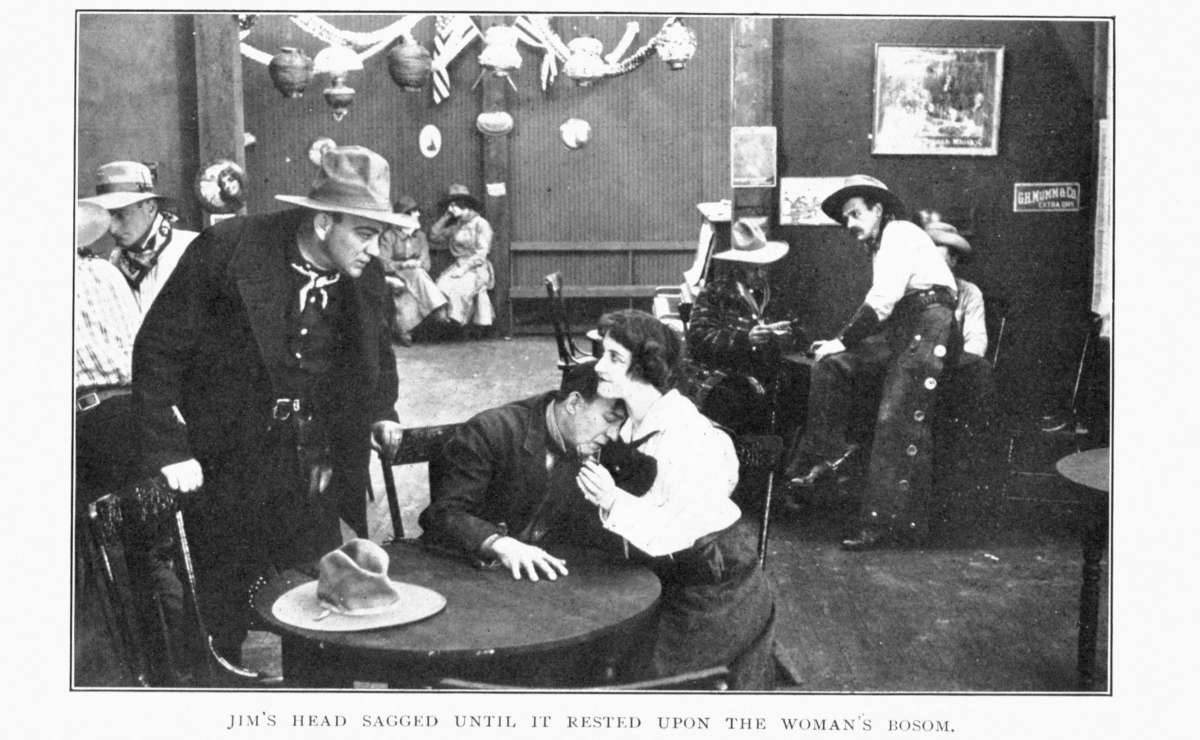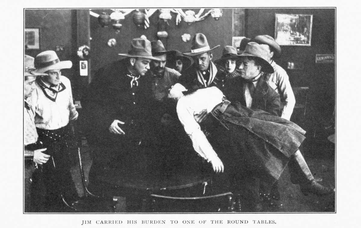 Thus, it came to pass that, in the days of his dwelling under the roof of the man whom he was determined to wrong, the visitor played the hypocrite with his host, aping a manner of bluff, candid good-fellowship. With the wife, too, he played the hypocrite. He dared[23] not let her so much as suspect the hot fires that burned in him as he looked yearningly on her loveliness. He realized, at the outset, that her devotion to the man of her choice remained unaltered. He knew that the open confession of his illicit love would move her to scorn and loathing. Only by guile, and that of the craftiest, could he hope for triumph over loyalty and love. With the passing days, the task loomed before him as one almost impossible of achievement. From all that he knew of Jim's past life and all that he could learn concerning the husband's reputation in the community, there showed nowhere any least opportunity for attack. And attack must be made, for only by destroying the wife's faith could he have any opportunity to gain her favor. It occurred to him that, in a conspiracy, he would have need of accomplices. To get some information concerning such as might serve his end, he often rode alone to the town, while Jim was occupied with ranch affairs. There, he entered easily into the vulgar dissipations of the place, making[24] himself hail-fellow-well-met with the riff-raff of the saloons and dance-houses, both men and women. The occupation was, in truth, congenial enough to him; for there was a coarseness in his nature that found satisfaction in loose living. Before he had been a week at the ranch, he had become known to all the blear-eyed habitués of Murphy's saloon—to some of the women frequenters there as well, and to certain men who were not blear-eyed; for they drank little, but played poker much. With these latter, especially, Dangerous Dan fraternized, since, like many a wiser man and better, he greatly admired poker—and his own playing of it.
