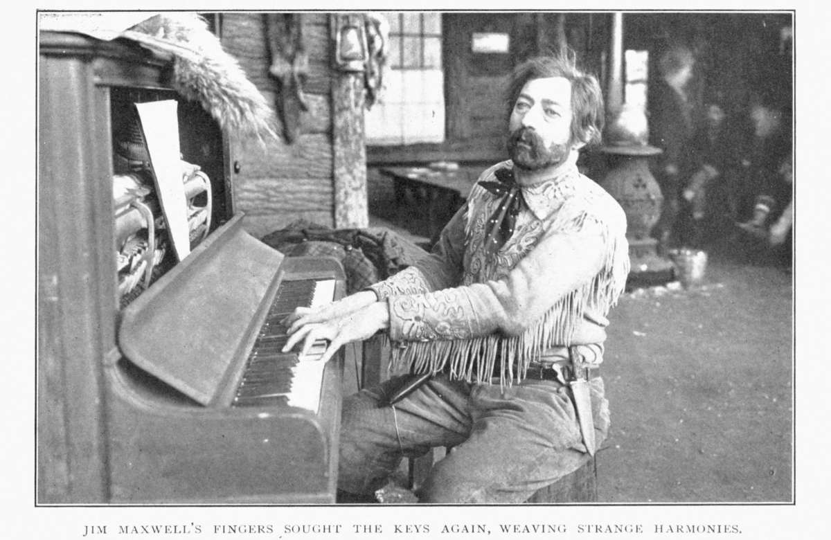 "I'm not specially keen on dry-nursing Dan McGrew," Jim remarked plaintively. "We were never really intimate, though we were friendly enough. To tell the truth, Lou, I'm mighty sorry Dan's coming here." His face was somber as he gazed into his wife's eyes and read in their clear light sympathy with his own repugnance at the prospect. With an impatient ejaculation, he sprang to his feet and went into the house, where he seated himself before the grand piano that occupied the[17] center of the spacious living-room. In a fierce crashing of dissonances, he voiced the resentment that was in him. But after a little, indignation somewhat relieved by such audible interpretation, his fingers flew into rippling arpeggios, out of which came, at last, a lilting melody, joyous, yet tender. For Jim Maxwell, lover of music all his days, had a gift of improvisation, with a sufficient technique for its exercise. To it he resorted often for the sounding of his deeper moods, and in it found a never-failing solace. So now, presently, soothed by his own art, he got up from the piano and went back to the porch, where he faced his wife, smiling.