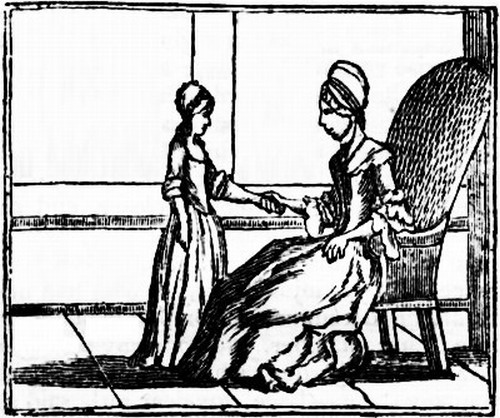 Peggy was very fond of her young lady, as indeed was every servant in the house; but there was a good woman, who went in the family by the name of Nurse, for whom Jemima had a still greater attachment[Pg 9]. She had attended Mrs. Placid before her marriage, had nursed all her children from their births, and Jemima was the darling of her heart. As she entered the room at this time, she took the weeping girl into her lap, and wept herself at the reflexion, that it was the first time in her life she had slept without her!—And so pray, my dear, said she, take care of yourself, and when you go to bed, mind that they pin your night-cap close at the top, otherwise you will get cold; and do not forget to have your linen well aired; for otherwise it is very dangerous, love; and many a person, by such neglect, has caught a cold which has terminated in a fever. Sweet child! I do not like to trust it from me, added she, hugging her still closer, and smothering her face in a check cotton handkerchief, which she wore on her neck. Jemima promised an observance of her injunctions, and being now dressed, attended a summons from her mamma, who was alone in her chamber, the company having left her to walk in the garden, whither she was unable to accompany them.—I see, my dear girl, said she, holding out her hand as she sat in an easy chair by the window; I see that you are sorry to leave me; and indeed, Jemima, I am much grieved that such a separation is necessary; but I hope I shall be better when I return; and I am sure you would wish me to be quite well. I hope, therefore, that you will be a good child while you stay with your uncle and aunt, and not give more trouble than you cannot avoid. You know, my love, that although you are going among strangers, yet you will be properly and kindly taken care of; and though I do not say it is so agreeable as to be at home with your nearer friends, yet, as we cannot have every thing we wish for, we must not be fretful, because that will not[Pg 10] give us what we desire, and will certainly make us more uncomfortable, and be disliked by all those with whom we are connected. There are a great many little things, Jemima, which you know I frequently tell you of, and which you must endeavour to remember when I am not with you. Therefore, do not forget to hold up your head, and behave gracefully; and when you are at dinner, if you should be offered any thing improper, that is, what you are not permitted to have at home, be sure civilly to refuse it, and say, Your mamma does not choose you should eat any. My only reason, you must be convinced, for denying you any indulgence of that kind, is, because it would disagree with you, and make you ill; and you are so good, I dare say, as never to do those things when your papa and I are absent, which we should prevent if we were present.—Miss Placid assured her mamma of her obedience, and her firm resolution to mind all her admonitions; when she resumed her injunctions, and[Pg 11] added—There is one thing, my dear, of more importance than the rest, which I would have you chiefly attend to: whatever may be your temptation to the contrary, remember to speak the truth. Your absence from me will be no excuse for the neglect of your duty; and if once you forfeit your honour, I can have no farther dependence upon you; and never venture to rely on the concealment of a fault; for you may depend upon it, such things are found out when least expected; but if they should not be, the unhappiness you would feel at having behaved wrongly, would be a great punishment of itself. Yet I need not, I dare say, have mentioned this to my Jemima, as she is at all times so good as to deserve reliance; only as you are going to be left quite to yourself, I thought it necessary to put you particularly upon your guard.—Mr. Piner returning at this period, interrupted any farther discourse, only Mrs. Placid affectionately pressed her hand, and, after giving her a kiss, Jemima sat down on a little stool by her side.