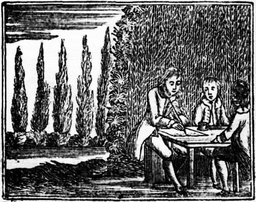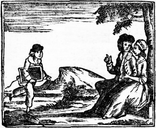 Jemima likewise tried every method in her power to moderate her resentment; representing, that it was no fault of Master Wagstaff's, and advising her to be more composed, and to join in their play again; but all in vain, she would only fret, grumble, and interrupt their entertainment. So Sam retired to a bench in the alcove, and sitting down[Pg 64] with the Master Placids, left her to her ill-humour, while he wrote the following verses:—