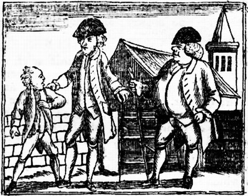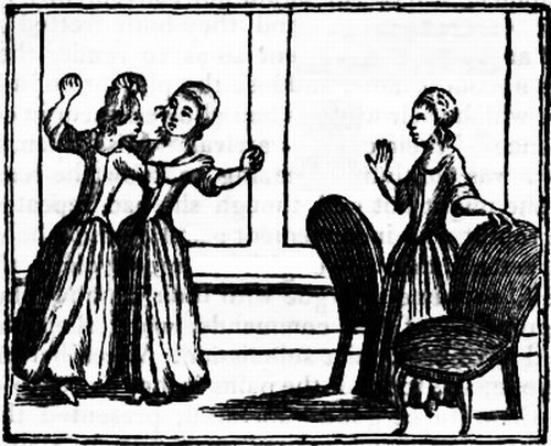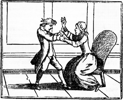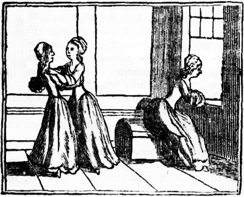 The conversation was here concluded by the entrance of Mr. Wagstaff and his son; and as they stayed the rest of the day, there was no farther opportunity to resume it. While the young folk were all at play in the evening in the summer house, Ellen ran away with Sam's hat, and he pursued her for some time without overtaking her; but at last a scuffle ensued, as she held it fast, and sometimes put it under one arm, sometimes under the other; then knelt upon it; and afterwards sat down upon it.[Pg 63] In this last attitude, as Master Wagstaff was struggling, she endeavoured to rise, but his foot being upon her frock, she tore a sad rent in it; and one of his buttons having caught in her ribbon, did as much damage to that likewise.