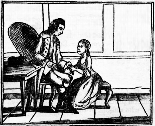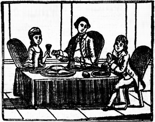 Mrs. Placid blamed them for the rudeness of such declarations, and took the young ladies and Jemima up stairs to their apartment, while tea was getting ready. During this interval, William climbed upon his father's knee, and as Mr. Placid was holding both his hands while he leaned back his head till it nearly touched the ground, he pulled him up, and kissing him, said, I am surprised, my boys, that you have not more politeness, than to neglect Miss Piners in such a manner, and endeavour to excuse it by further[Pg 39] rudeness. Why, I do not want them, replied William, and must not I speak the truth? You always tell me that the naughtiest thing I can do, is to tell lies; and, I am sure, I am very sorry they are come, for I like to have Jemima to ourselves; so pray, Sir, what would you choose I should do? I would have you, my dear, returned his papa, always endeavour to behave with good-nature and politeness. You cannot think how much it will recommend you to general approbation; nor of how great importance an attention to the trifling graces of your conduct will prove in future life. And although you, William, may not be glad of your cousins' company (which, in my opinion, is rather a churlish speech), yet you might have behaved with civility; might have inquired after your uncle and aunt, have reached them each a chair to sit down upon, and if you had not (as you cannot do it with truth) said you was glad to see them; yet you might have taken such notice, by speaking kindly to them, as to vindicate[Pg 40] yourself from the charge of rudeness and ill-manners, which you have now incurred.—But as we are boys, Sir, said Charles, such a neglect is not so bad in us, as it does not so much signify. We are not, you know, expected to sit prim all the day, as the girls do, and play the lady. O! how I should hate to sit with my hands before me, bridling like them for a whole afternoon together, without moving any more than my stick when I put it up in the corner! I would not be a girl to go into company in such a manner for the world!—I am glad to see you satisfied with your destination, replied Mr. Placid; but you are much mistaken, I assure you, if you think the study of politeness is unnecessary to a man; and however you may flatter yourselves with an exemption from those more confined rules of behaviour which young ladies are expected to observe, yet I would advise you to remember, that a constant attention to your carriage is at all times necessary, if you would wish to be loved and esteemed, or to meet with success in your undertakings.—You, Charles, have frequently remarked the amazing difference which is visible between Colonel Armstrong, and Sir Hugh Forester, though the one is a man of more sense, of larger fortune, and equally worthy as the other; yet, you regard the Colonel with admiration, and are too apt to treat the Baronet with ridicule and contempt; so great are the advantages of that polish, which can only be acquired in early youth by diligent and constant attention: for if you accustom yourself to lounge about, to eat with your fingers, or hold your knife and fork so low that they scarcely save them from the grease; if you slovenly dirt your clothes, either omit to bow at all or else bend your body as aukwardly as Jack Carter, the plough-boy; in short, if by any such[Pg 41] trifling neglect you acquire a habit of clownish ill-manners, you will fail to gain that respect which is only paid to true merit, when accompanied by the graces. Custom has made it necessary for you to be particularly attentive to the wants of those with whom you are in company: you should use yourselves to watch when a lady's cup is empty, that you may be ready to take it from her; or any thing has fallen down by accident, that you may with briskness pick it up; when a chair is wanting, to fetch it; or to give any assistance in your power in those trifles which occur every day; and which, by attending to, you will learn a habit of doing, as it were, mechanically; that is, without the trouble of thinking about it, in the same manner as you eat your dinner, without reflecting all the time what you are doing.—I confess, said Charles, that Colonel Armstrong has always struck me as the most agreeable man I ever saw; but he does not seem to take any peculiar trouble to behave better than other people. On the contrary, I have heard my mamma say, that he is more easy in his manners than Sir Hugh, who labours to be polite, without in the least looking like a gentleman.—That ease which you mention, said his father, is the degree of perfection which I am so solicitous to have you acquire, and which is the most difficult thing to attain, though it appears to be exercised without trouble or attention. You must therefore endeavour, by the influence of custom, to gain those natural advantages, which can only be learned in the early season of youth, and to the neglect of which it is to be ascribed, that so few men (comparatively speaking) are either polite or graceful.