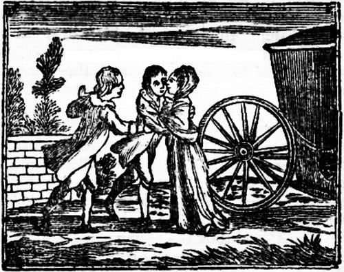 I shall not take up your time with any account of their journey, nor endeavour to describe the places which they passed through in their way to Smiledale, whither they arrived about five o'clock in the afternoon. Jemima ran to her mamma with a degree of rapture which evinced the sincerity of her joy, in returning to her embraces, as soon as her brothers would permit her to disengage herself from their caresses; for as they knew the day which was fixed for their return, and could nearly guess at the time she would arrive, they had taken their stand at the very place where they had parted with her; and as soon as the carriage came in sight, they ran with their utmost speed to meet it, and came back again, jumping by the side, and when the[Pg 38] coach stopped, were so eager to welcome their sister, that they would scarcely leave room for her to get out, and they were in such a hurry to show her every new acquisition they had made since her departure, that they would not allow her time to speak to any body but themselves.