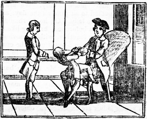 There was once a gentleman and a lady who had two children, a boy and a girl. They were somewhat like you; that is, were troubled with short memories: for although they were frequently told[Pg 52] to hold up their heads, turn out their toes, and say, Sir and Madam; when they addressed any body, they constantly forgot to do it. Their papa was one day lamenting this negligence of his children to a person who paid him a visit, and who replied, that if he would trust them to his management, he would engage in a short time so deeply to impress it upon their minds, that they should ever after retain his instructions on their memory. To this proposal the gentleman very willingly agreed; and Master Ben and his sister Peggy accompanied their papa's friend to his house. As they were acquainted with the design of their visit, he addressed them the next morning in terms to this purpose:—As you well know what is expected from you, and have been fully instructed in the requisite attentions of polite behaviour, I shall hope you will observe them very minutely; and in order to remind you when you are forgetful, I shall keep this little spur in my hand; and whenever I see occasion shall take the liberty of applying it, which will give you a sharp degree of pain; and therefore, I dare say, you will take care to avoid it. Besides this, I shall, as opportunities arise, punish your neglect by the loss of your meals, or any thing else which I may think proper to deprive you of; and the sooner you remember to observe every thing which you are desired, the sooner you will return to your parents; with whom, if your memories remain sufficiently good to do as you are bid, you will continue; but whenever that fails you, they will turn you to my instructions. The young folk listened very attentively to this discourse, and promised obedience to his commands; in which promise their intention was to be sincere, and he caressed them accordingly. But, my dear[Pg 53] Charles, little Ben soon forgot, that to loll his arms on the table at dinner-time was by no means consistent with good manners; upon which his new tutor applied his spur with such success to his elbows, that the smart he experienced, in a moment occasioned their removal. His sister had soon reason to sympathize with his misfortune from her own feelings; for as she had an ugly custom of drinking with her mouth full, and breathing in her glass, the reminding spur attacked her cheek so sharply, that the smart would not let her forget the cause which had given an opportunity for its use.