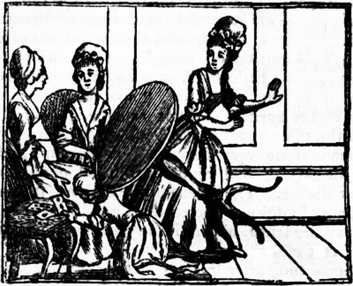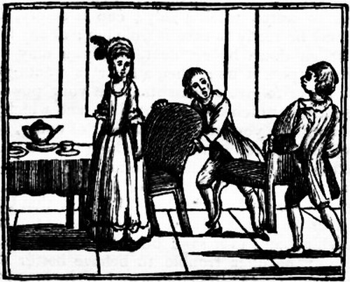 Added to her uncle's displeasure, Miss Myra had, in some degree, suffered herself; having torn a muslin apron which she was working, and which she had unpinned to show to Miss Wagstaff. Such was the state of affairs, when Mr. Speedmore, a young country gentleman, entered the room. He was about seventeen, very tall, and clumsy in his appearance, and entirely destitute of those graces which Mr. Placid had, the preceding evening, recommended to his sons. As soon as he had muttered over his first compliments to the master of the house, he sneaked himself into a chair that stood near the door, and sitting down on one side of it, placed an oak stick, which he held in his hand, between his legs, and leaning his chin upon the top, sometimes nibbled the head, and at others gnawed a piece of his glove, which happened to be unsewed.[Pg 49] Miss Myra surveyed his figure with the utmost contempt, and whispered to her companion, Miss Wagstaff, that she should like to teaze such a boor; which, she supposed, might be easily done, by obliging him to speak, as he absolutely seemed to have lost his tongue.