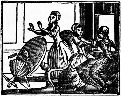 Some time after this, as Miss Myra was stooping to pick up her scissars, Bob contrived to put a large spider upon the lappet of her cap, which very quietly marched about without being perceived, and entertained itself with the prospect of her ribbons, gauze, and flowers, surveyed her curls, and examined the beauty of a bow which hung from the middle of her head-dress. It afterwards very leisurely took its progress down her neck, the tickling sensation of its footsteps she attributed to some loose locks, which she stroked up with her hand. This motion quickened its descent, and it now invaded her shoulder, and took its path quite in sight down her arm, where she first discovered its appearance. With a scream, which the whole house might have heard, she hastily jumped across the room and overset a little table, at which the ladies were at work, and which falling on poor Jemima, gave her a most violent blow on the head and shoulders, she being at a distance playing with her cousins at cards. The company, who were all ignorant of this sudden disturbance, begged Miss Myra to inform them[Pg 46] what was the matter with her? which she at length complied with, by exclaiming, A spider! a spider! What shall I do? Take it off, or I shall faint!—This Samuel immediately did; but as her affectation was truly ridiculous, he was determined to divert himself still further with the effects of her folly. In the mean time her uncle blamed her, with some warmth, for the childish foolishness of her behaviour. One would have thought, said he, it had been a giant instead of a spider with which you were engaged. Such an outcry, indeed, for nothing at all—I am quite ashamed of you! And pray see what mischief you have done to Miss Placid! The young lady, in some confusion, apologized for the hurt which her impetuosity had occasioned; and Jemima, who was seldom ruffled by a trifling accident, soon resumed her usual cheerfulness, though she felt the pain for a considerable time. Peace and order being once more re-established, a basket of fruit was brought to please the children,[Pg 47] together with some biscuits, and some small seed cakes, which Mrs. Wagstaff had provided for their entertainment.