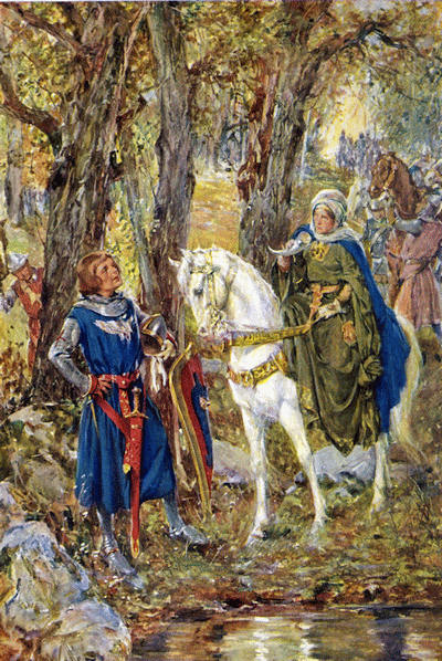 The train came toward him, and now he heard the sound of it, the tread of horses, metallic noises, the human voice, all subdued to a deep murmur as of an incoming sea. This increased until single notes were distinguishable. The form grew larger, then he could see component forms. Music was being made, he saw the great blue banners.... And still he knew that all was a mightier and a brighter thing than yesterday he had known.... Now he saw the Princess of Roche-de-Frêne riding between Beauvoisin and Stephen the Marshal.