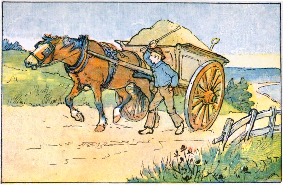 Although this horse is doing all he can to drag his heavy load up the hill, the lazy boy who is walking beside him, with one hand in his pocket, beats him cruelly with the stick which he carries. The boy is too silly or too careless to see how willingly the horse is working.