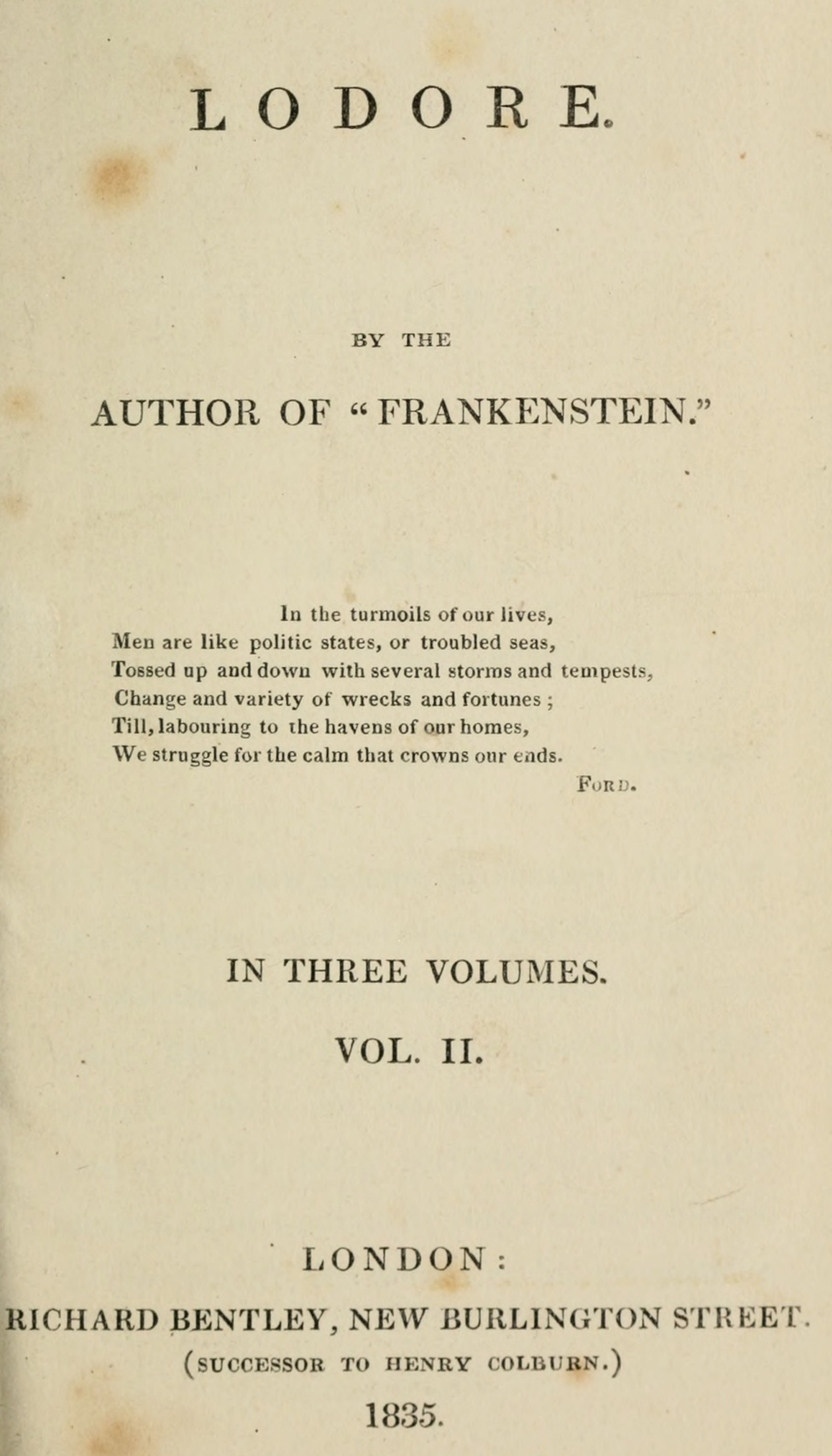 Lady Santerre died. After the first burst of natural grief, Cornelia began to reflect that Lord Lodore might now imagine that every obstacle to their reconciliation was removed. She had looked upon her husband as her enemy and injurer; she had regarded him with indignation and fear;—but now she hated him. Strong aversion had sprung up, during the struggles of passion, in her bosom. She hated him as the eternal barrier between her and one who loved her with rare disinterestedness. The human heart must desire happiness;—in spite of every effort at resignation, it must aspire to the fulfilment of its wish. Lord Lodore was the cause why she was cut off from it for ever. He had foreseen that this feeling, this combat, this misery, would be her doom, in the deserted situation she chose for herself: she had laughed his fears to scorn. Now she abhorred him the more for having divined her destiny. While she banished the pleasant thoughts of love, she indulged in the poisoned ones of hate; and while she resisted each softer emotion as a crime, she opened her heart to the bitterest resentment, as a permitted solace; nor was she aware that thus she redoubled all her woes. It was under the influence of these feelings, that she had written to Mrs. Elizabeth Fitzhenry that harsh, decided letter, which Lodore received at New York. The intelligence of his violent death came as an answer to her expressions of implacable resentment. A pang of remorse stung her, when she thought how she had emptied the vials of her wrath on a head which had so soon after been laid low for ever.