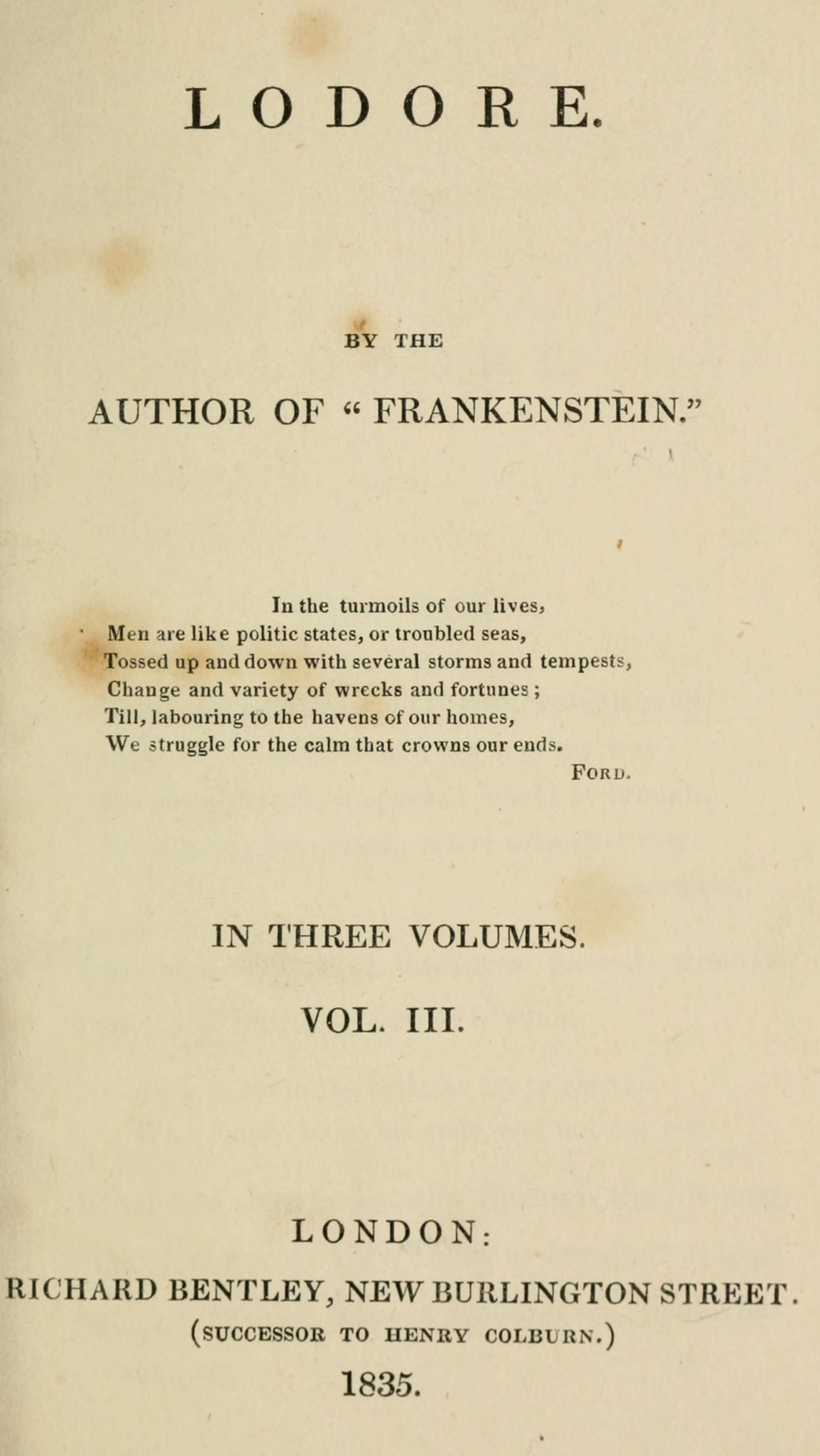 During the half delirium, the disturbed and uncontrollable, but not unmeaning reveries, of her fever, the idea of visiting Lodore's grave had haunted her pertinaciously. She had often dreamt of it: at one time the tomb seemed to rise in a lonely desert; and the dead slept peacefully beneath sunshine or starlight. At another, storms and howling winds were around, groans and sighs, mingled with the sound of the tempest, and menaces and reproaches against her were breathed from the cold marble. Now her imagination pictured it within the aisles of a magnificent cathedral; and now again the real scene—the rustic church of Longfield was vividly present to her mind. She saw the pathway through the green churchyard—the ruined ivy-mantled tower, which showed how much larger the edifice had been in former days, near which might be still discerned on high a niche containing the holy mother and divine child—the half-defaced porch on which rude monkish imagery was carved—the time-worn pews, and painted window. She had never entered this church but once, many, many years ago; and it was strange how in sleep and fever-troubled reverie, each portion of it presented itself distinctly and vividly to her imagination. During these perturbed visions, one other form and voice perpetually recurred. She heard Ethel continually repeat, "Come! come!" and often her figure flitted round the tomb or sat beside it. Once, on awakening from a dream, which impressed her deeply by the importunity and earnestness of her daughter's appeal, she was forcibly impelled to consider it her duty to obey, and she made a vow that on recovering from her illness, she would visit her husband's grave.