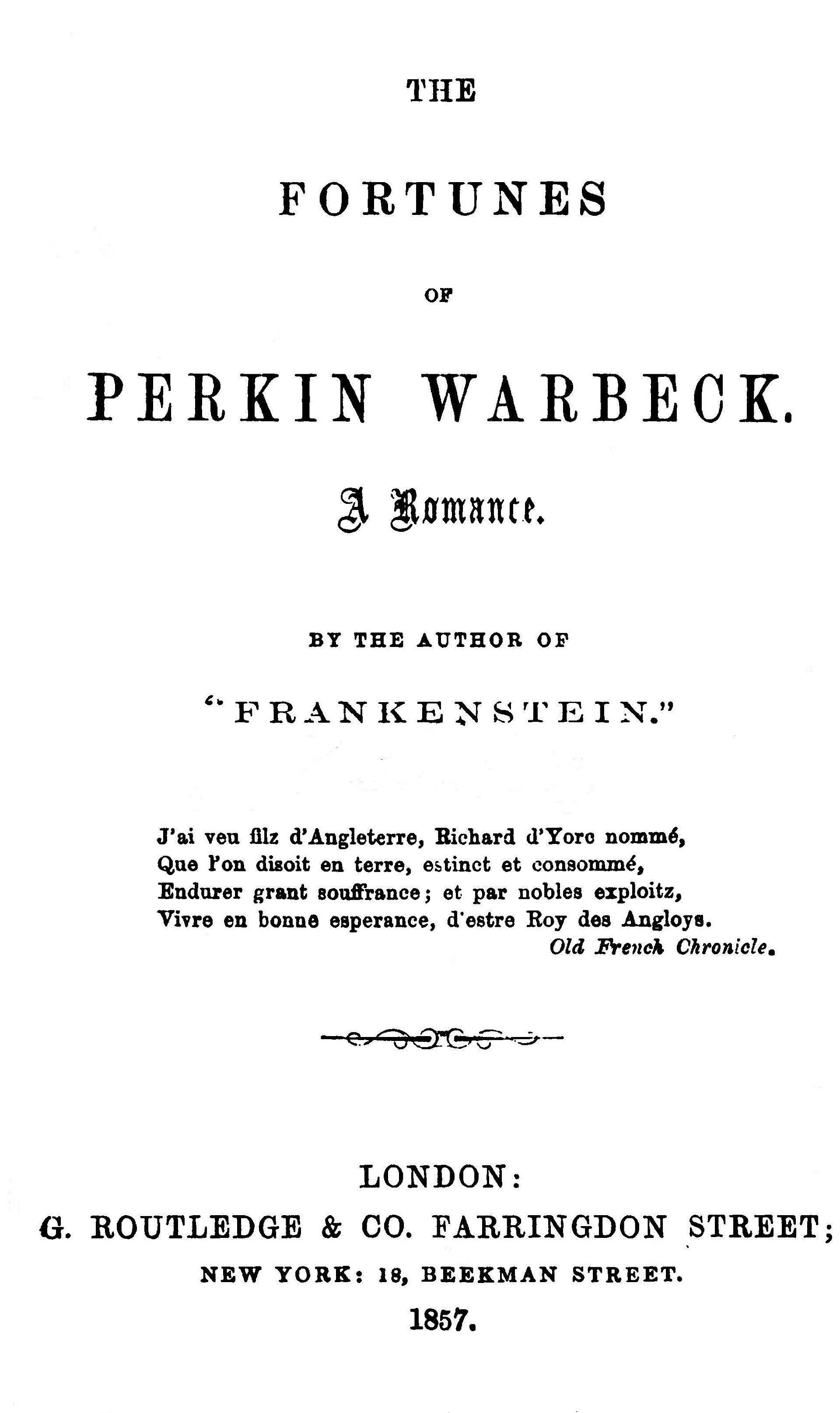 This is not the place for a discussion of the question. The principal thing that I should wish to be impressed on my reader's mind is, that whether my hero was or was not an impostor, he was believed to be the true man by his contemporaries. The partial pages of Bacon, of Hall, and Holinshed, and others of that date, are replete with proofs of this fact. There are some curious letters, written by Sir John Ramsay, laird of Balmayne, calling himself Lord Bothwell, addressed to Henry the Seventh himself, which, though written by a spy and hireling of that monarch, tend to confirm my belief, and even demonstrate that in his eagerness to get rid of a formidable competitor, Henry did not hesitate to urge midnight assassination. These letters are printed in the Appendix to Pinkerton's "History of Scotland." The verses which form the motto to these volumes, are part of a rhythmical chronicle, written by two subjects of Burgundy, who lived in those days; it is entitled, "Recollection des Merveilles, advenues en nostre temps, commencée par très élégant orateur, Messire Georges Chastellan, et continuée par Maistre Jean Molinet."