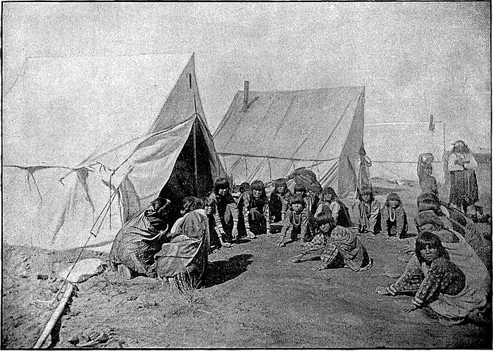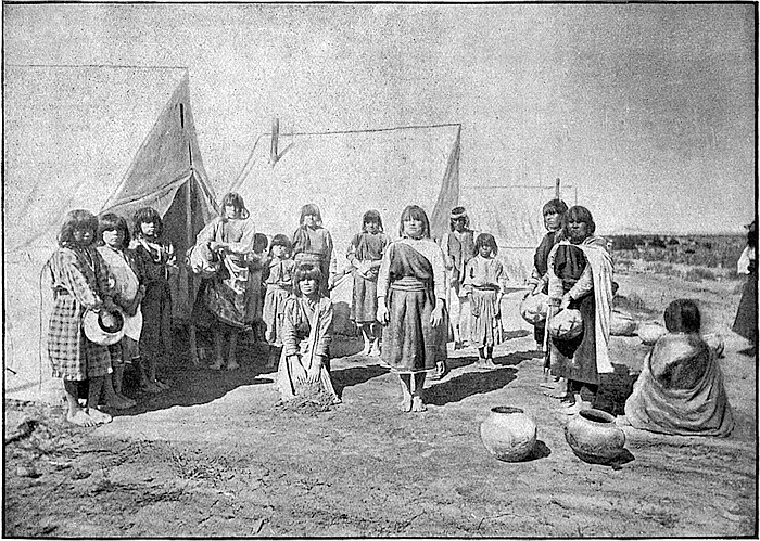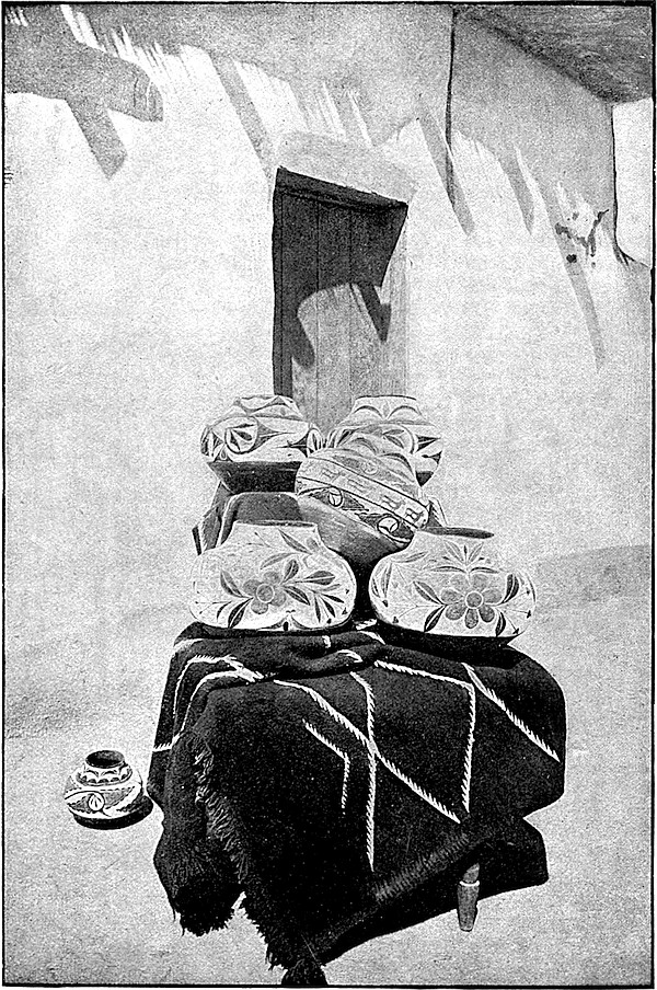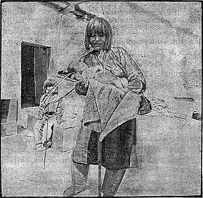She then placed the infant in the writer’s arms, saying, “The child is named; it is yours.” When the child was returned to her she washed its head in yucca suds, and bathed its body by again filling her mouth with water and spirting it over the child. It was afterwards rubbed with ashes, especially about its face, and the doctress gave it some warm water to drink by dipping her fingers into the vase and letting the drops fall from them into the infant’s mouth; the child smacked its lips in evident satisfaction; and it was then strapped to the cradle which was handed the doctress by the grandmother; and the child in the cradle was placed on the mother’s lap, and she proceeded to nourish it.