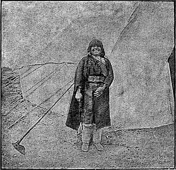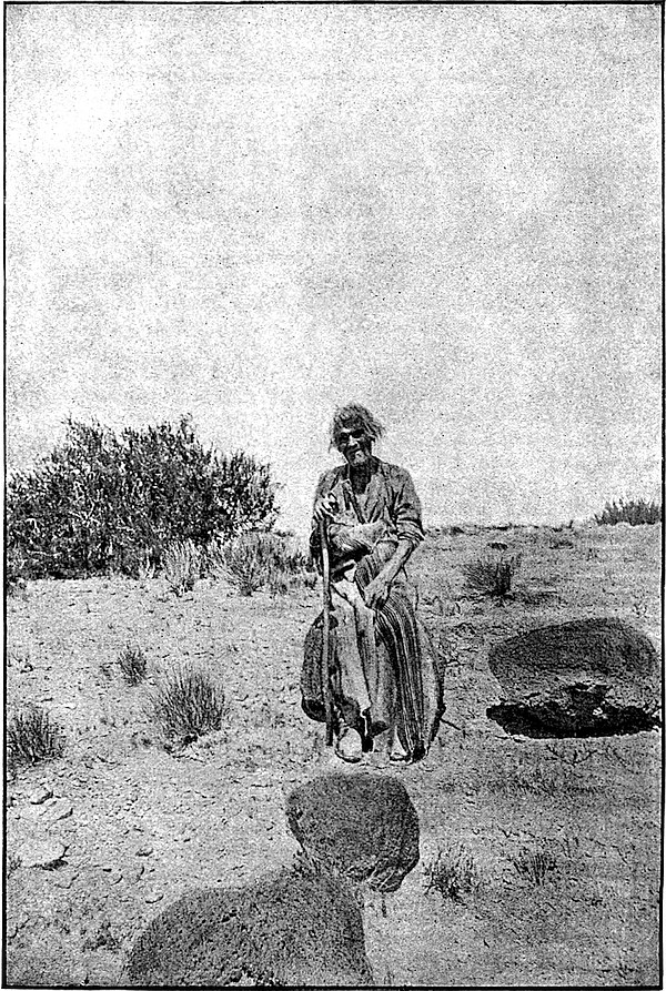 The grandfather brought an Apache basket containing a pyramid of meal and held it to the infant’s face, then to the mother’s, who blew upon the meal. The grandmother then blew upon it (that it might be blessed with the best thoughts of the breath of life) and, stooping, the grandfather held the basket with both hands while the doctress (Fig. 19) held it on the opposite side with her two hands, the grandfather whispering a prayer and then retiring to the far end of the room. The doctress offered a silent prayer, and left the room without farther ceremony, carrying the basket of meal, which was a gift to her from the infant, it 142being her only compensation for her services. The mother of the infant ate heartily and at half past seven in the morning she walked fully 200 yards from the house down a declivity, and on her return to the house was bathed for the first time since her confinement, she herself doing the bathing.