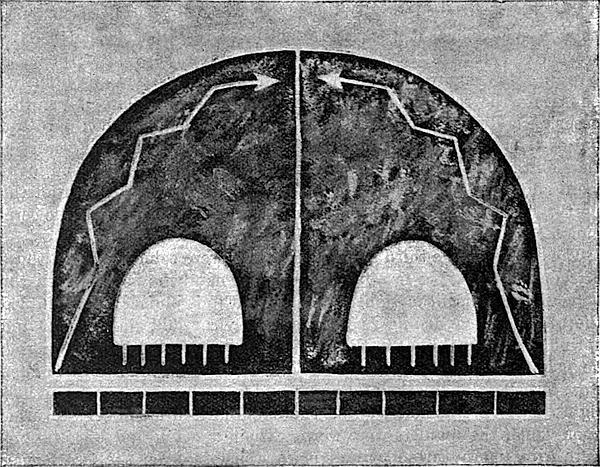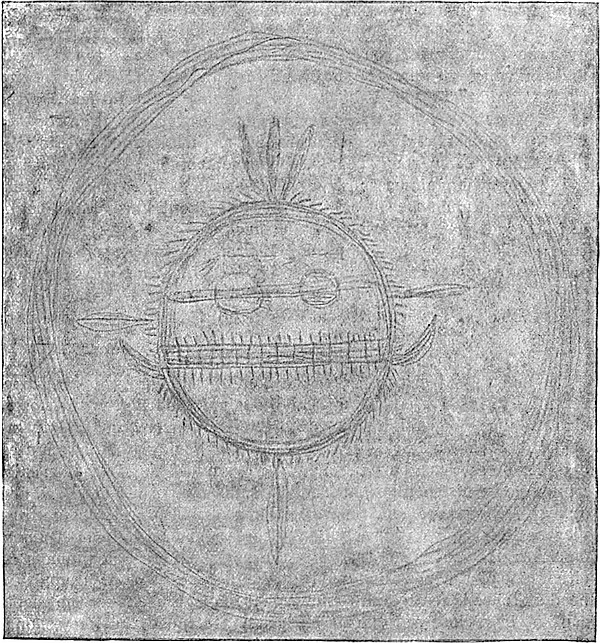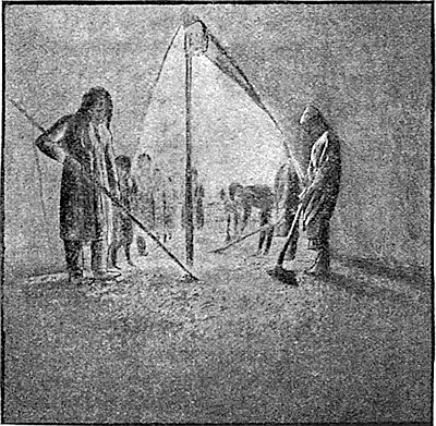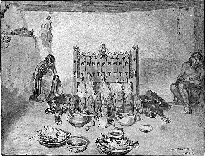Upon reaching the entrance to the lower world a spirit is met by two guards to the entrance, who say to them, “So you have come here,” and the spirit replies, “Yes.” “Where is your credential?” inquires the chief guard, and the spirit shows his hä´chamoni, and the guard says, upon examining it, “Yes, here is your hä´chamoni to your mother, Sûs´sĭstinnako, that she may know you came promptly over the straight road; she will be pleased.” If the spirit be not provided with hä´chamoni it can not enter the lower world, but must roam about somewhere in the north. After examining the hä´chamoni, the guard says, “You may enter Shipapo and go to your mother in the lower world.” The first one met by the spirit in the lower world is Ût´sĕt, who says, “You have come from the other world?” and the spirit replies, “Yes.” Then Ût´sĕt says, “You bring a hä´chamoni?” and the spirit replies, “Yes.” “Let me see your hä´chamoni,” and, after carefully looking over it, she hands it to Sûs´sĭstinnako, who says, “Good! good!” and, pointing to146 the dead relatives of the newly arrived spirit, she adds, “There, my child, are your relatives; go join them and be happy.” When one has been very wicked in this world he is not permitted to enter the lower world even though he has a hä´chamoni. The guards at the entrance can read all hearts and minds, and they put such spirits into a great fire which burns in the earth below somewhere not far distant from Shipapo. The spirit is burned to death in this fire and can never know anything, as it is entirely destroyed. When ti´ämonis and ho´naaites have performed their duties in this world with unwilling hearts, it is known to the mother in the lower world, and when such men enter after death they are made to live apart, and alone, and without nourishment for a certain period of time, depending upon the amount of purification required. Some sit alone for two years; others for five, and some for ten before the mother considers them worthy to enter into peace.