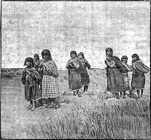 On the evening of the 23d they gathered as before into the living room, which had been specially prepared for the event. A small quantity of raw cotton, a knife, and a string lay upon a shelf, and the infant’s small wardrobe, consisting of a tiny sheet of white cotton, pieces of calico and a diminutive Navajo blanket, which were gifts to the child, were laid on a table in the farther end of the room. The family sat in anxious expectancy.