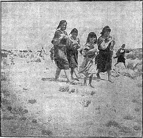 The coyote traveled a great distance, and in the middle of the day it was very hot, and he sat down and rested, and he thought as he looked up to ti´nia, “How I wish the cloud people would freshen my path and make it cool;” and in a little while the cloud people gathered above the road the coyote was to travel over, and he rejoiced that his path was to be shady and cool; but after he had traveled a short distance, he again sat down, and, looking upward, said, “I wish much the cloud people would send rain, that my road would be fresher and cooler.” In a little while a shower came, and the coyote was contented and went on his way rejoicing; but in a short time he again sat down and wished that the road could be very moist, that it would be fresh to his feet, and almost immediately the road was wet as though a river had passed over it, and the coyote was very contented.