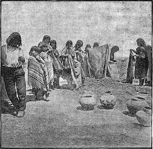 When a death occurs any time before sundown, the body is buried as soon as it can be prepared for the grave; but if one dies after dark the body must not be touched until after sunrise, when it is bathed and buried as soon as possible. It is usual for an elderly woman of the clan to bathe the body, cold water being used; the head is washed first in yucca suds. Sometimes, however, this method is deviated from, if the remaining wife or husband has a special friend in some other clan. In the case of a man the breechcloth he has worn during his last illness is not removed. The immediate relatives in consanguinity and clan are present during the bathing and make the air hideous with their lamentations. The body is bathed on the bed upon which the party dies and here it remains until burial. The mourners are seated around the room, no one being near the bed but the woman who prepares the body for burial. If the corpse be a female, after the body is bathed a blanket is laid across the abdomen and limbs and tucked in on either side, the upper portion of the body being exposed.