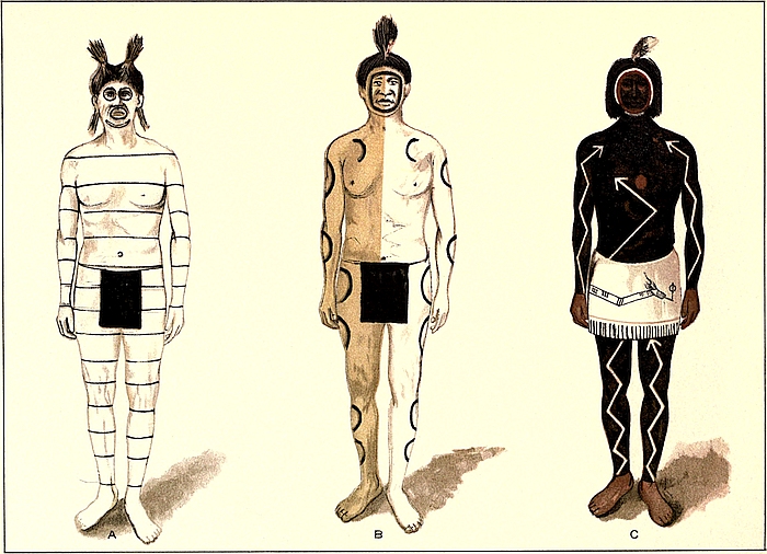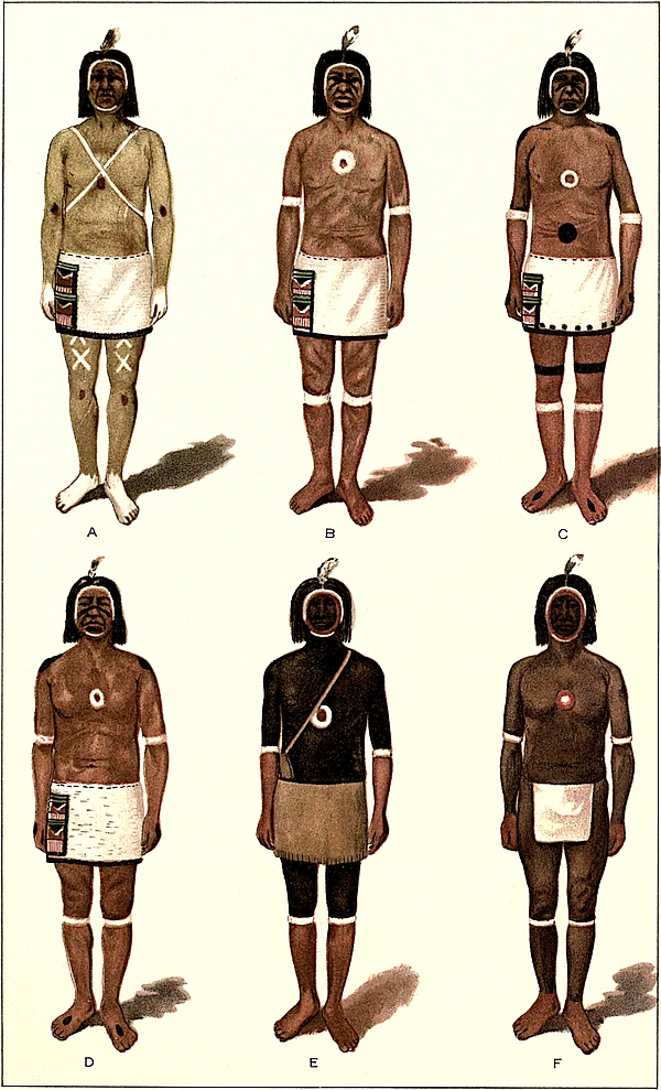 | Personal adornment when received into the third degree of official membership of Cult society (A, spider; B, cougar; C, fire; D, Knife and Giant; E, costume when victor is received into society of Warriors; F, body of warrior prepared for burial, only the face, hands, and feet being painted) |