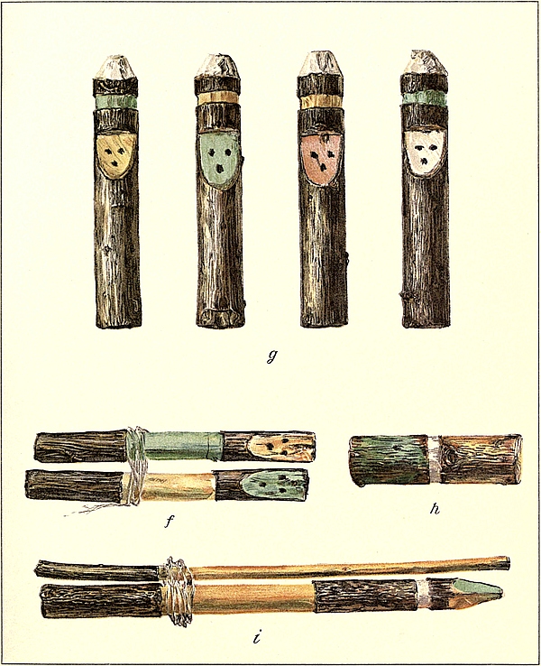 | Hä´-cha-mo-ni with plume offerings attached (F, hä´-cha-mo-ni deposited for the Sia woman of the north and of the west; G, hä´-cha-mo-ni offered to the cloud woman of the cardinal points; H, gaming block offered to the cloud people; I, hä´-cha-mo-ni and official staff deposited for the snake ho´-na-ai-te of the north) |