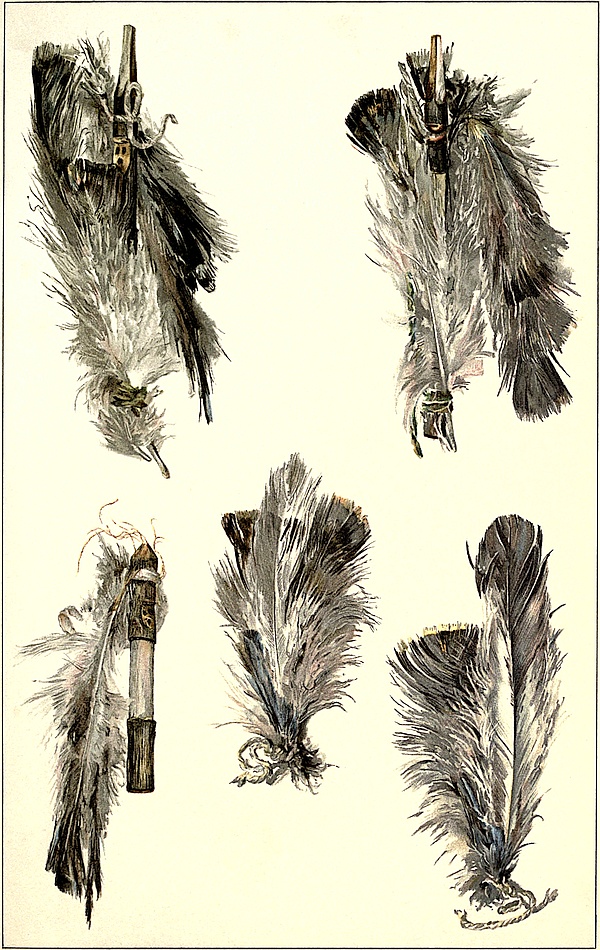 He then gave a pinch of the powdered-plant medicine to the woman for the good health of the woman and child, and her mother, lifting ashes from the fireplace with her right hand, deposited them upon the floor in front of the woman. The father, then, standing, dipped the ashes with his eagle plumes, holding one in either hand, and, striking the under side of the plume held in the left hand with the one held in the right, threw the ashes to the cardinal points. Each time, after throwing the ashes, he passed the plumes down each side of the woman. When the plumes are struck the ho´naaite says: Mĭsh´ᵗcha hätch´ᵗse kótawa ohwichaini u´wak—“Ashes man, permit me to make good medicine for the child.”