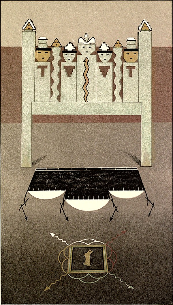 The ho´naaite laid three small buckskin medicine bags on the floor in front of him (one containing shell mixture, another the pollen of edible and medicinal plants, and the third a plant medicine powdered), and, holding the quill ends of two eagle plumes between his hands, he repeated in a low tone the following prayer;
