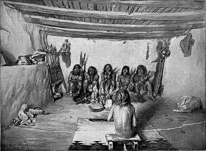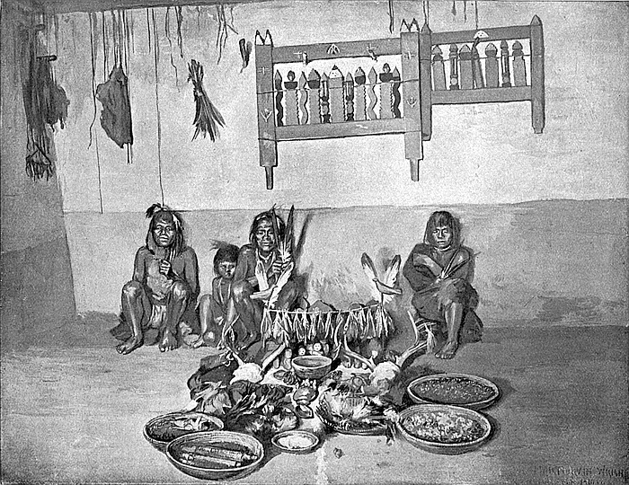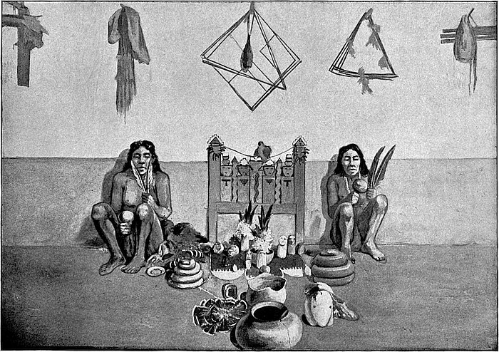 The doctress (Fig. 19) and sister of the woman’s husband, who had been summoned, arrived almost immediately. The father and husband removed their moccasins and the women had their legs and feet bare. The father took his seat upon a low chair in front of his daughter, the doctress sat to her left, clasping an ear of yellow and purple corn, and the writer by the side of the doctress, holding a medicine-stone which had been given her some days previously by the doctress to be used on this occasion. The husband sat upon his wadded blanket against the wall, and by his side were his two sons and his sister, she having with her an infant and a child some 2 years of age. The night was warm and the door of the room was left open.