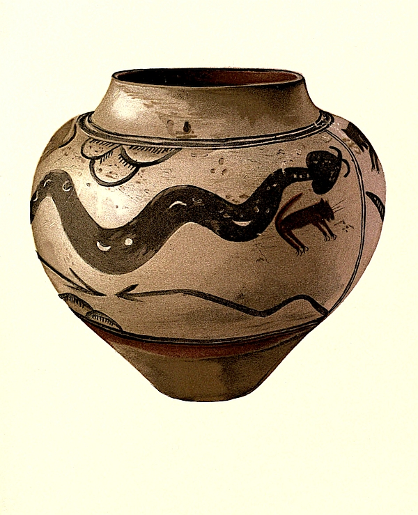 The myth of the ska´tona (a monster plumed serpent) who, in the old time, ate the people, is familiar to every man, woman, and child of Sia. This serpent, who lived in the mountains, did not move to catch the people, but drew them to him with his breath; he never called but one person at a time, compelling each one to approach sidewise so that he could not be seen. The hand was usually grabbed first, then the serpent would take the hand into his mouth and gradually devour his victim.