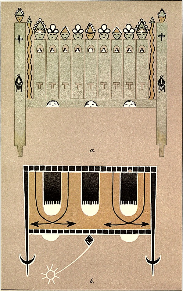 [13] This society differed from the one of the same name afterwards organized in the upper world; knife in the former referring to the implement used for domestic and other purposes, while the word in the latter indicates the arrows presented to Ma´asewe and U´yuuyewĕ, the two war heroes, sons of the sun, by their father.