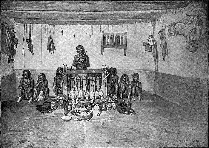 The ho´naaite discovers the diseased parts of the body through the instrumentality of ashes, and with the scattering of ashes to the cardinal points, physical and mental impurities are cast from those present and the chamber is also purified.