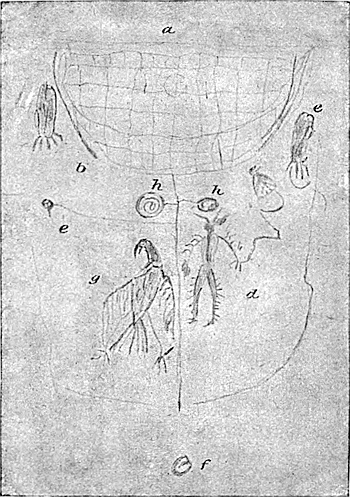 [19] All the figures show the feet as they are colored before the moccasins are put on. The red spot on the body designates the heart, the black spot on the figure of the member of the fire society indicates the coal which is eaten. The white around the face, arms, and legs is down from the breast of the hawk.