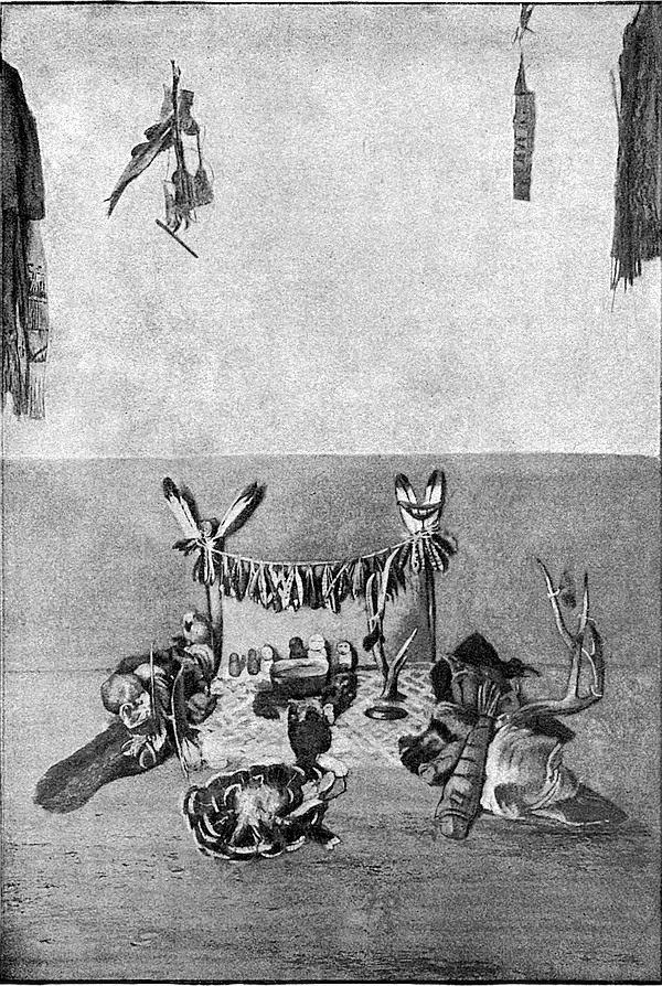 | Altar of Knife society, with ho´-na-ai-te and vice ho´-na-ai-te on either side |