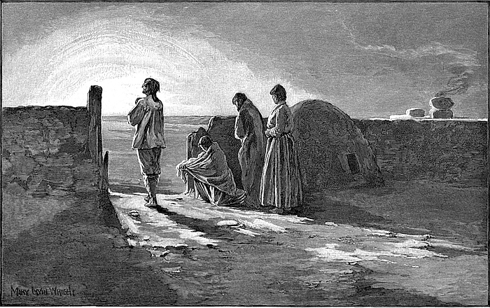 “When the years were new and this village had been built perhaps three years, all the spirits of our dead came here for a great feast. They had bodies such as they had before death; wives recognized husbands, husbands wives, children parents, and parents children. Just after sundown the spirits began arriving, only a few passing over the road by daylight, but after dark they came in great crowds and remained until near dawn. They tarried but one night; husbands and wives did not sleep together; had they done so the living would have surely died. When the hour of separation came there was much weeping, not only among the living but the dead. The living insisted upon going with the dead, but the dead declared they must wait; that they could not pass through the entrance to the other world; they must first die or grow old and again become little children to be able to pass through the door of the world for the departed. It was then that the Sia first learned all about their future home. They learned that the fields were vast, the pastures beautiful, the mountains high, the lakes and rivers clear like crystals, and the wheat and cornfields flourishing. During the day the spirits sleep, and at night they work industriously in the fields. The moon is father to the dead as the sun is father to the living; the dead resting when the sun travels, for at this time they see nothing; it is when the sun returns to his home at night that the departed spirits work and pass about in their world below. The home of the departed spirits is in the world first inhabited by the Sia.”