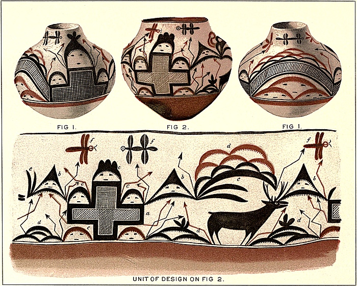 | Ceremonial water vases; Sia (A, a cross emblematic of the rain from the cardinal points; B, faces of the cloud men; C, faces of the cloud women; D, clouds and rain; E, vegetation; F, dragonfly, symbolic of water) |