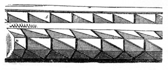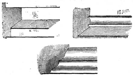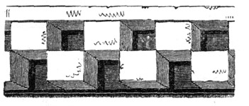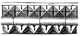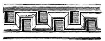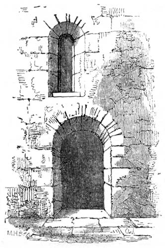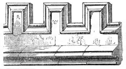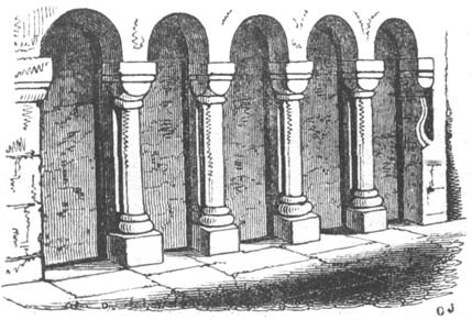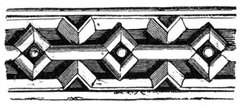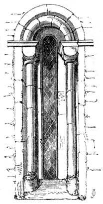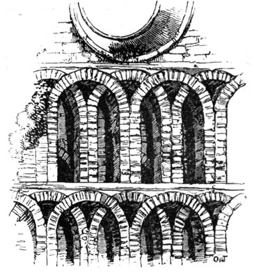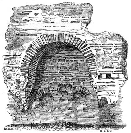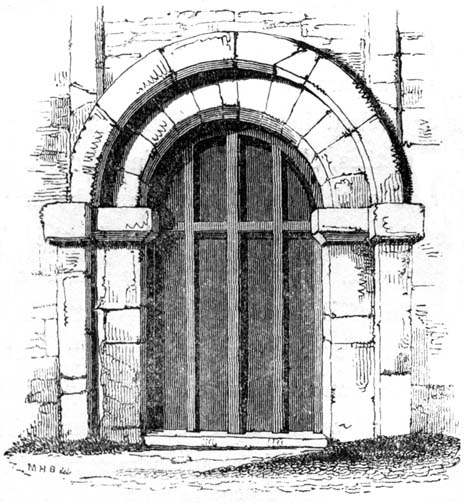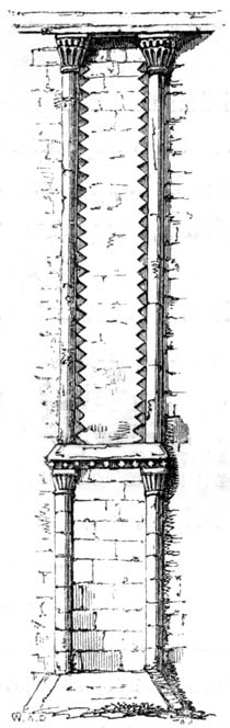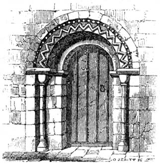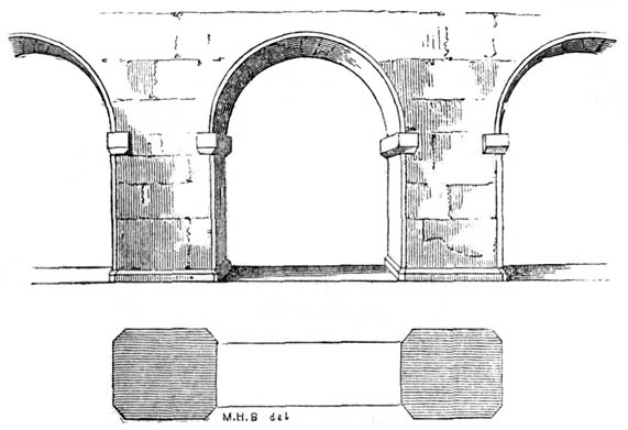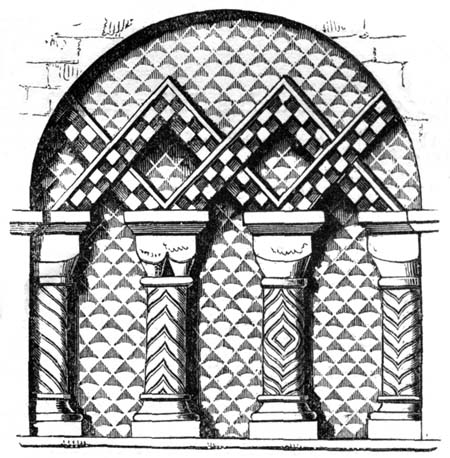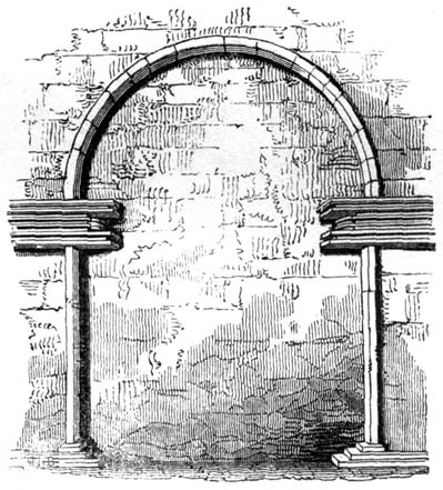 But independent of examples afforded by some few ancient Roman churches, and such of the temples and public buildings of the Romans as were then remaining in Britain, the Saxon converts were directed and assisted in the science of architecture by those missionaries from Rome who propagated Christianity amongst them; and[6] during the Saxon dynasty architects and workmen were frequently procured from abroad, to plan and raise ecclesiastical structures. The Anglo-Saxon churches were, however, rudely built, and, as far as can be ascertained, with some few exceptions, were of no great dimensions and almost entirely devoid of ornamental mouldings, though in some instances decorative sculpture and mouldings are to be met with; but in the repeated incursions of the Danes, in the ninth and tenth centuries, so general was the destruction of the monasteries and churches, which, when the country became tranquil, were rebuilt by the Normans, that we have, in fact, comparatively few churches existing which we may reasonably presume, or really know, to have been erected in an Anglo-Saxon age. Many of the earlier writers on this subject have, however, caused much confusion by applying the term ‘Saxon’ to all churches and other edifices contradistinguished from the pointed style by semicircular-headed doorways, windows, and arches. But the vestiges of Anglo-Saxon architecture have been as yet so little studied or known, as to render it difficult to point out, either generally or in detail, in what their peculiarities consist: the style may, however, be said to have approximated in appearance much nearer to the Debased[7] Roman style of masonry than the Norman, and to have been also much ruder: and in the most ancient churches, as in that at Dover Castle, and that at Bricksworth, we find arches constructed of flat bricks or tiles, set edgewise, which was also a Roman fashion. The masonry was chiefly composed of rubble, with ashlar or squared blocks of stone at the angles, disposed in courses in a peculiar manner.