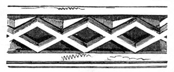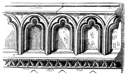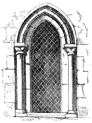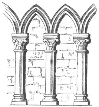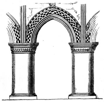 When the original Norman style of building was first broken through, by the introduction of the pointed arch, which was often formed by the intersection of semicircular arches, the facing of it, or architrave, was often ornamented with the zig-zag, billet, and other mouldings, in the same manner as the Norman semicircular arches: it also rested on round massive piers, and still retained many other features of Norman architecture. But from the time of its introduction to the close of the twelfth century, the pointed arch was gradually struggling with the semicircular arch for the mastery, and with success; for from the commencement of the thirteenth century, as nearly as can be ascertained, the style of building with semicircular arches was, with very[10] few exceptions, altogether discarded, and superseded by its more elegant rival.