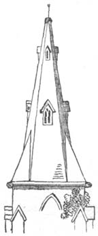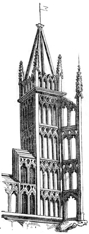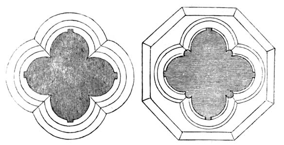 A. The general ground plan of cathedral and conventual churches was after the form of a cross, and the edifice consisted of a central tower, with transepts running north and south; westward of the tower was the nave or main body of the[21] structure, with lateral aisles; and the west front contained the principal entrance, and was often flanked by towers. Eastward of the central tower was the choir, where the principal service was performed, with aisles on each side, and beyond this was the lady chapel. Sometimes the design also comprehended other chapels. On the north or south side was the chapter house, in early times quadrangular, but afterwards octagonal in plan; and on the same side, in most instances, though not always, were the cloisters, which communicated immediately with the church, and surrounded a quadrangular court. The chapter house and cloisters we still find remaining as adjuncts to most cathedral churches, though the conventual buildings of a domestic nature, with which the cloisters formerly also communicated, have generally been destroyed. Mere parochial churches have commonly a tower at the west end, a nave with lateral aisles, and a chancel. Some churches have transepts; and small side chapels or additional aisles have been annexed to many, erected at the costs of individuals, to serve for burial and as chantries. The smallest class of churches have a nave and chancel only, with a small bell-turret formed of wooden shingles, or an open arch of stonework, appearing above the roof at the west end.