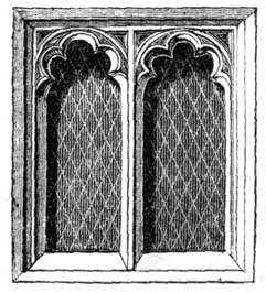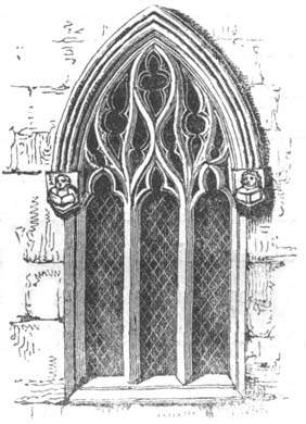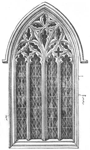 In the latter part of the fourteenth century another transition, or gradual change of style, began to be effected, in the discrimination of which an obvious distinction again occurs in the composition of the windows, some of which are very large: for the mullion-bars, instead of branching off in the head, in a number of curved lines, are carried up vertically, so as to form[13] perpendicular divisions between the window-sill and the head, and do not present that combination of geometrical and flowing tracery observable in the style immediately preceding.