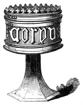 158-* It is much to be regretted that of late years many ancient fonts have been cast out of our churches, and earthenware and pewter basins substituted in their stead for the administration of the holy sacrament of baptism: a practice not authorized by the Anglican church, but rather condemned; for in the canons set forth by authority, A. D. 1571, it is provided that “Curabunt (Œditui) ut in singulis ecclesiis sit sacer fons, non pelvis, in quo baptismus ministretur, isque ut decenter et munde conservetur.” And in the canons of 1603, after alluding to the foregoing constitution, and observing that it was too much neglected in many places, it is appointed “That there shall be a font of stone in every church and chapel where baptism is to be ministered; the same to be set in the ancient usual places.” In the orders and directions given by Bishop Wren, A. D. 1636, to be observed in his diocese of Norwich, we find it enjoined, “That the font at baptism be filled with clear water, and no dishes, pails, or basins be used in it or instead of it.”