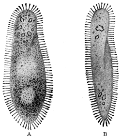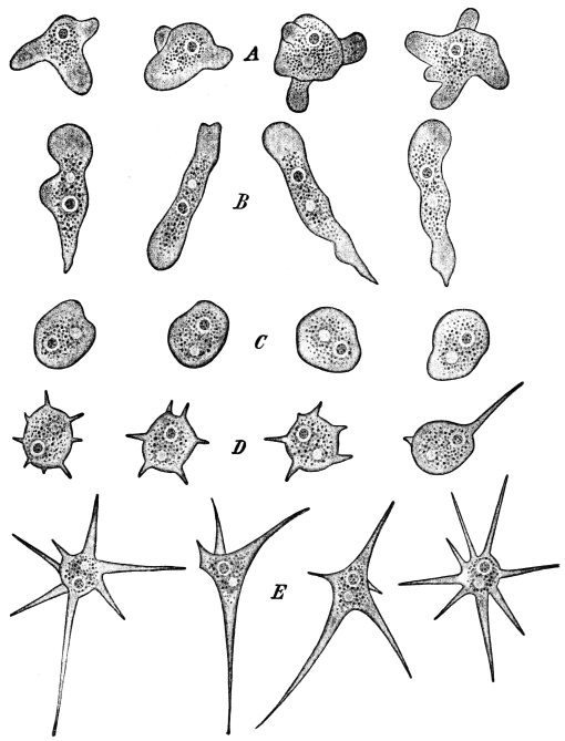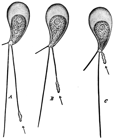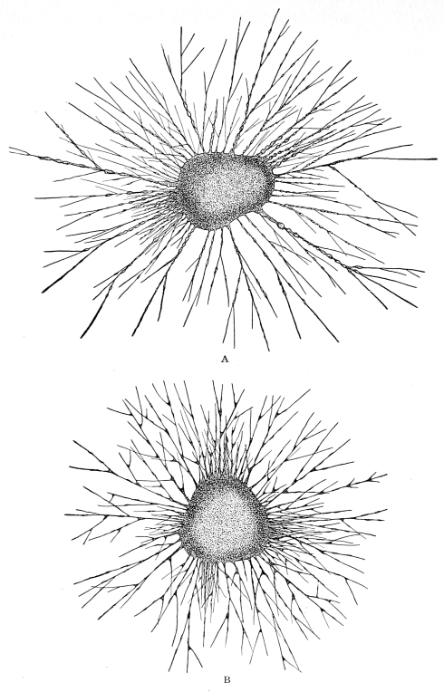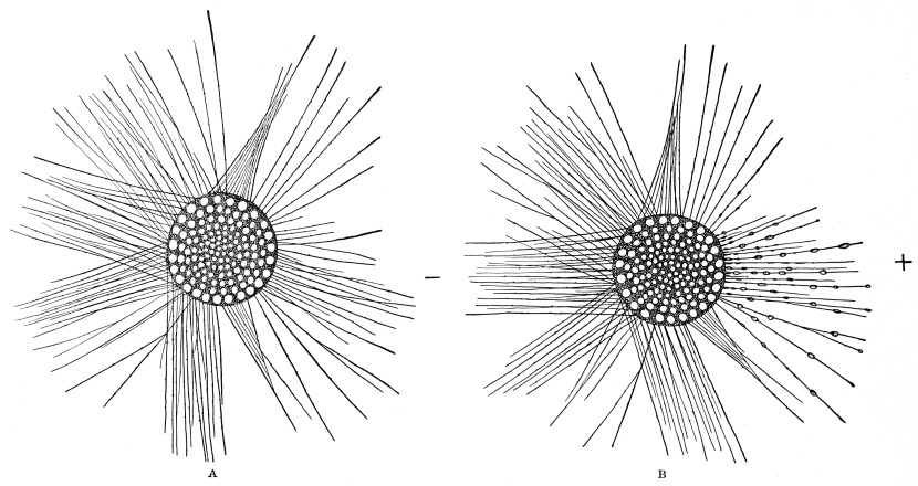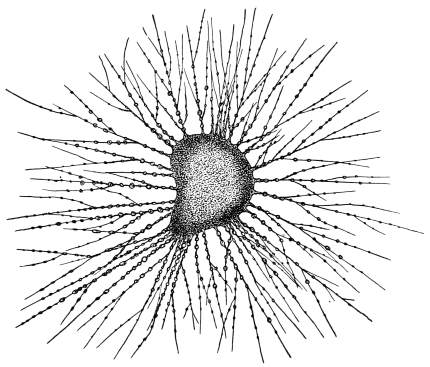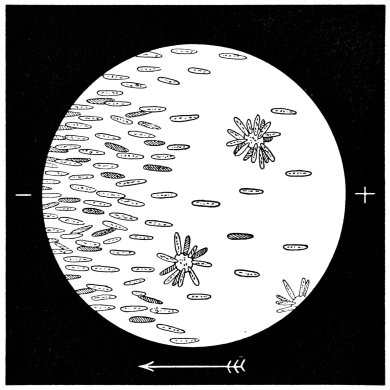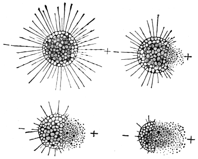 Since then the inhibitory processes in nerves have been frequently investigated by Schiff (1823–1896), Goltz (1834–1901) and others, who gave us a theory concerning the same. Only a small number of inhibitory processes were known at that time, as for instance the inhibition of the croak reflex of the frog, or the inhibition of the grasp reflex during copulation of these animals through skin stimuli, and a few other cases. They regarded the inhibitory nervous processes as a special state, of which the inhibition of the heart through the vagus was the best illustration. Further, the Russian physiologist Setschenow succeeded by directly stimulating certain parts of the central nervous system, especially the optic lobes of the frog, in producing inhibition. It was, therefore, frequently assumed, as Setschenow did, that in the brain there exist special inhibitory centers, just as there are motor centers. This view was later shown to be untenable. It is only quite recently, and especially since Sherrington has shown that inhibition plays a part in all antagonistic muscle movements, that we have obtained a broad and more thorough understanding of the inhibitory processes in the life14 of the organism, and a physiological explanation of this important group of activities of the central nervous system. This inhibitory effect of stimulation, brought about by the involvement of the central nervous system in the normal organism, was studied side by side with the depressing effects of stimulation. Claude Bernard (1813–1878)9 first discovered that the excitation of all living substance could be depressed or totally suspended through the influence of certain anæsthetics, such as ether or chloroform. By a series of experiments, as simple as they were convincing, the French scientist showed that irritability could be depressed in mimosa leaves, the growth of germinating plant seeds and the ferment action of yeast cells stopped, likewise the disintegration of the carbon dioxide in the cells of the green leaf, as well as the development of the egg cells, and also the movements of the animal organism and the sensations of man. By this means he recognized that not only does all living protoplasm possess irritability, but that it can also by means of certain substances be put into the condition of “anæsthesia,” a state dependent upon a change of the protoplasm, which he termed “semi-coagulation.” Finally, besides the more apparent processes of excitation and those less so, belonging to the group of inhibition and depression, in the last century the knowledge of the subject was greatly increased by the addition of another group, which recently in consequence of various reasons has met with particular interest. These being effects of stimuli on the direction of movements of motile organisms, it became more and more recognized that these curious manifestations of irritability, which appeared to have such a surprising likeness to the mysterious attraction and repulsion in the sphere of electricity and magnetism, occur universally in the vegetable as well as in the animal world. These movements are of the greatest biological importance for the obtaining of food, propagation, protection against disease, etc. Botanists have long known of the geotaxis of the roots and stems of plants, the heliotaxis of their leaves and flowers and of the thigmotaxis of their tendrils. Likewise the phototaxis of freely moving15 protistæ had been often observed, especially by Ehrenberg10 of Berlin, well known for his researches on infusoria. Then Engelmann, Pfeffer, Strassburger, Stahl, and many others discovered and studied more carefully the facts concerning chemotaxis, thigmotaxis, rheotaxis, geotaxis, phototaxis, etc., of bacteria, motile spores, rhizopoda, and so on. The question arose if one should regard this singular behavior of the unicellular organisms as an expression of conscious sensations, discrimination or will. This view was as determinedly denied on the one hand as it was accepted on the other. Whilst even today certain scientists still consider the reactions of the unicellular organisms as a manifestation of conscious sensation, discrimination or will, others look upon them as unconscious reflex reactions of cell organism, taking place as purely mechanically as the spinal cord reflexes of vertebrates. This divergence of opinion would have practically no value for the development of our knowledge of irritability had not here, as in the case of the relations between the mental and physical processes in man, the view been entertained with more or less fervor, that at some stage or other in the chain of the purely physiological processes of responsivity, an intangible factor had been introduced which was considered as the essential “cause” of the peculiar reactions to stimuli. It is not here the place to enter into the question if, and in what degree, animal psychology may be a field of scientific research. Even if one looks upon conscious processes as effects of stimulation, in both lower animals and in man, in no case should one assume them to be factors of an essentially different nature, interrupting the chain of the mechanical reactions; neither should one consider the particular characteristic responses observed in unicellular organisms as effects of non-mechanical “causes.” As a result, a mysticism, in reality quite foreign to it, would be introduced into physiology. As a matter of fact the physiological investigations for the tropic reactions of stimuli, which have been carried out in great number since the end of the eighties, have shown more and more clearly that this peculiar behavior of unicellular organisms towards unilateral stimuli is produced16 by a comparatively simple mechanism. The analysis of this shows a difference in the intensity of the exciting or depressing effect produced by the stimulus. The stimulus exerts its influence unequally upon the specific activity of the motor 