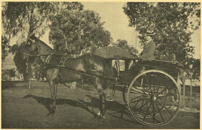 As I was watching the camp making I heard “Coo-e-e! Coo-e-e!” the Australian bush cry, and presently a party of four miners rode up. They had just sold their mines for £17,000, and were on their way to Melbourne, en route for New Zealand to see their parents. They told me that, five years ago, they landed in the West with £200 between the four of them, and are now leaving with the above-mentioned sum; but they hope to come back to the Golden West after a six-months holiday. As you may imagine, they were very jolly; they took off their kits (bags), which contained provisions, we combined forces, and made a very pleasant meal under the shade of some pretty kurrajong-trees. At night, attracted by our fires, some natives appeared, but I felt quite safe with so many protectors. They made up a bed of bushes for me under the buggy, and put branches all around it. I felt as if I was in a Mia Mia (native hut), and was as comfortable as possible. I heard the natives saying, “Mimi lubra,” which means, “Woman in a tent.” They thought the men would not trouble to make a place like it for themselves, and their conjectures were right; they are not such a stupid race after all!