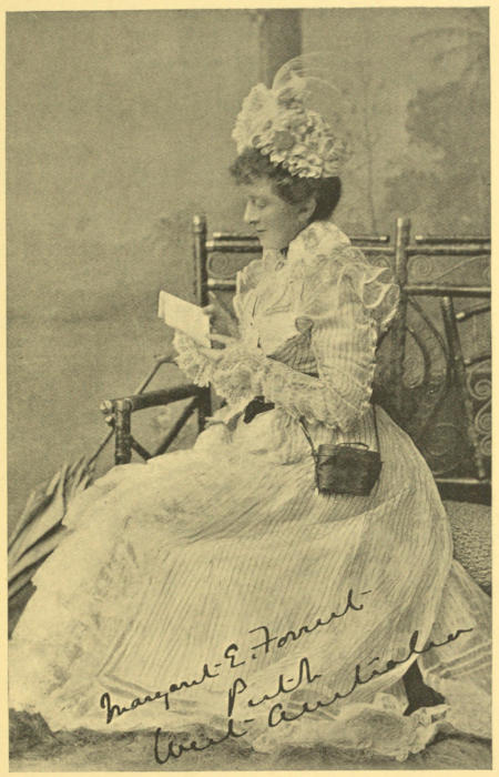 In the morning I took the train for Perth and Fremantle, and on arrival at the Perth railway station there, waiting for me, were my own horse and Ralli car. Didn’t we spin along through the park? I thought of the Mulga scrub and red dust “out back”; here the roads were red, but “with a difference,” and the grass and the trees delightfully fresh and green; surely the water never looked so sparkling. In and out through the trees along the winding road we drove, past the little villas, with their sweet gardens, up the hill, around the bend to the dearest spot on earth, “Home, sweet home.” The house and verandah were almost hidden by the glossy green leaves of the “Canadia” and passion vines; through the lattice of the fern-houses peeped the delicate pink blossoms of the tall ivy-geranium twined with the ever-flowering purple runner. The gate-porch and garden fence were embroidered from end to end with blue and green. Blue sea beyond, blue sky above. The gate was open, and thus my journey of two thousand miles came to an end. I hope that my record of it may help the reader to gain an idea of Western Australia.